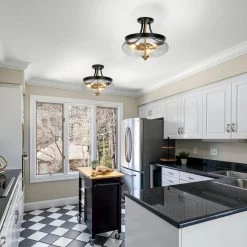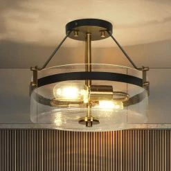 3-Light Modern Black and Gold Round Semi-Flush Mount Light with Wooden Beads by Uolfin