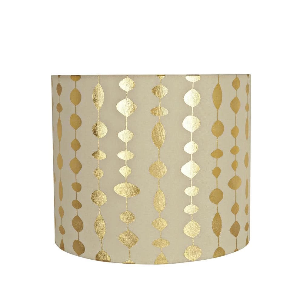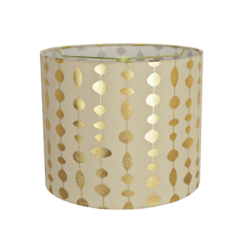 Aspen Creative is dedicated to offering a wide assortment of attractive and well-priced portable lamps, kitchen pendants, vanity wall fixtures, outdoor lighting fixtures, lamp shades, and lamp accessories. We have in-house designers that follow current trends and develop cool new products to meet those trends. Aspen Creative offers a 1 pack transitional Drum (Cylinder) lamp shade in beige. Made with faux linen fabric with gold print. The lamp shade size is 12 in. top x 12 in. bottom x 10 in. height. This lamp shade is a Spider construction designed to attach to lamp harp. Applications – For table lamps, accent lamps, vintage lamps, candle stick lamps and kid’s room lamps.