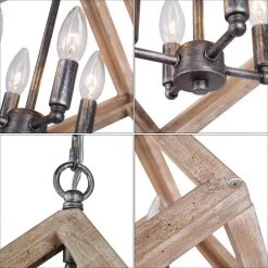 The farmhouse chandelier is the best choice for your new home! More and more interior designers pick this lamp for their customers to reach a high-end home deterioration and meet new home styles. You can pick it as a normal lamp for the dining room, living room, or bedroom, also good for your office. Lamp body size: L15.4″ xW15.4 “xH18″ Surface treatment: ancient wood dotting + black sweeping silver; Material + craft: iron + wood; Use environment: indoor (DRY); Working power: Type B, Max 40W; Main wire: 20288 18AWG transparent color, exposed 10Ft of the wire; exposed 10.5Ft of the ground wire; Lamp head wire: 150° or above 18AWG black and white wire; Lamp holder: E12 bakelite lamp holder; Sling chain: wire diameter 3.8mm total length: 5Ft; with movable locks at both ends; Kaaba cover: American standard universal, equipped with 4-point teeth and one-word mounting plate; Product label: UL label, E label, environmental label, model date label, QC label, lamp cap wattage label; Parts package: 1 copy of manual, two 8/32*1” machine screws, three P3 terminals