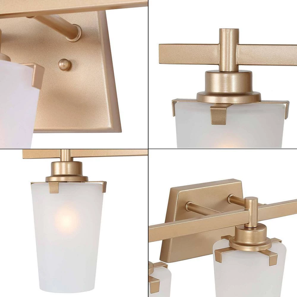This Modern Brass Gold Powder Room Vanity Light by Uolfin Lighting is driven by the golden linear frame to support 3 bell lampshades into operation. When the gold vanity light is installed on the wall of your bathroom or around the vanity mirror in the bedroom, the frosted lampshade allows the light to shine through softly on your face without dazzling your eyes. and everything that is also covered by the light becomes warm. When the lights are not turned on, this is the perfect combination of gold and white gauze-like colors. If this modern wall sconce meets your charming modern, modern farmhouse, cottage style house unexpectedly, everything is a beautiful collision. The gold wall sconce can also decorate your kitchen, porch, corridor, stairwell, bedside or a corner that needs lighting. Come and try such a beautiful feast.