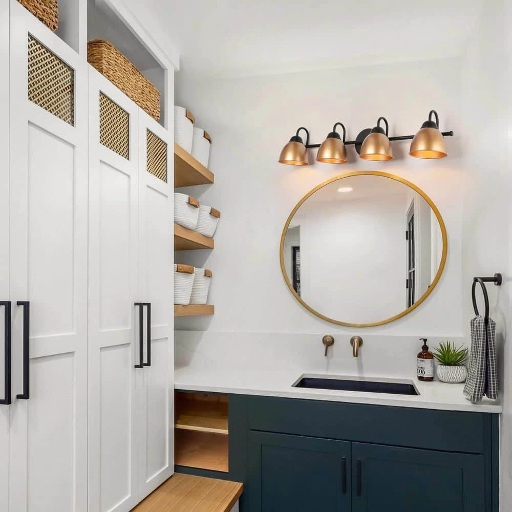 - MODERN BATHROOM VANITY LIGHT: Marrying modern and classic elements, this transitional metal vanity light fixture is coated in a gold finish, featuring a matte black circle backplate and black slender bars in a solid finish for a minimalist contemporary feel