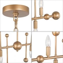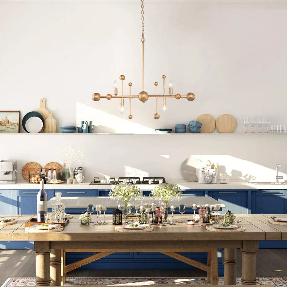 Creating an elegant atmosphere in your home with this Gold Modern Farmhouse Kitchen Island Chandelier Light by Uolfin. Combining gold color finished with classic candlestick design, the modern rustic chandelier light burst an antique appeal in modern decor style, perfectly suits various interior decorations. The gold transitional fixture body is connected to the round canopy by a 59-inch adjustable suspension chain, suitable for flat or slope ceilings. It supports up to (4) 40-Watt bulbs (not included), which can give your space sufficient light through its opening structure. Small house, vintage, modern, industrial, minimalist, contemporary, mid-century modern, transitional, or farmhouse styles, this contemporary linear chandelier can easily match. If your kitchen island, bedroom, dining room table, living room, entrance hall, stairwell, or guest room are looking for such a chandelier, this golden modern farmhouse candlestick chandelier will be a good answer.