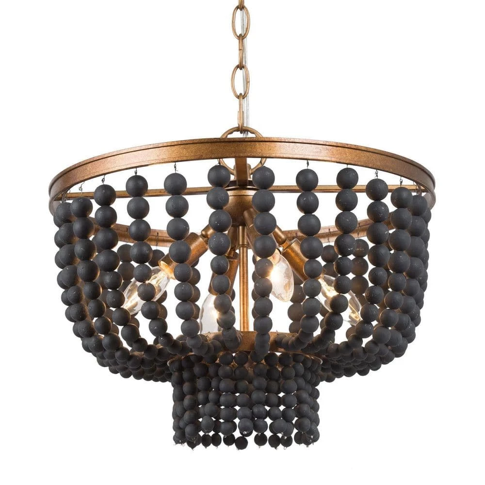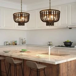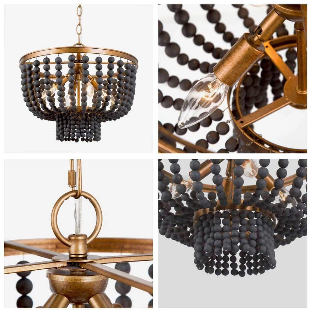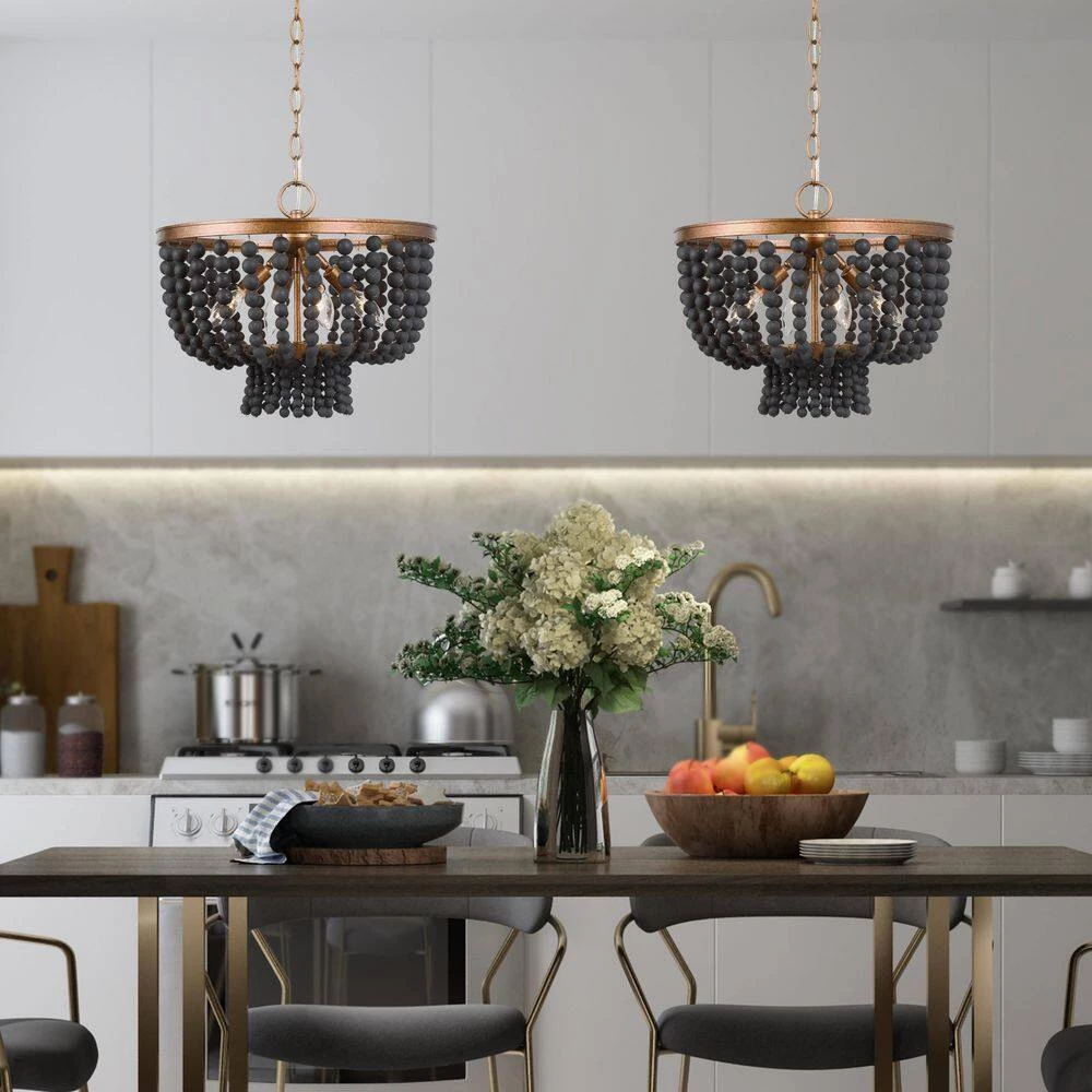 In modern life, light fixtures are not only used for lighting, but also for decorating and embellishing the entire home space. Fusion of both modern and traditional appeals, the chandelier light from Uolfin Lighting perfectly suits various decor styles, modern, farmhouse, vintage, traditional, and so on. The spray antique gold finish and texture appearance enhance the retro sense of the chandelier. While matching with strings of matte black wooden beads that are handcrafted, the strong color confrontation brings a visual impact. The shape design also protrudes the theme of the modern farmhouse of the chandelier, the drum shape is classic and shows off the curvaceous. 4 light bulbs (not included) are required 15.5-in width ensuring the light fixture emits enough amount light for dining table areas. For a dining table approaching or under 31-in width, hanging one of the chandeliers is enough, but for a dining table that is longer and larger or the kitchen island, multiply hanging or work with other extra light sources (chandelier/pendant light …) can reach a more ideal effect. Besides the dining room and kitchen island area, the chandelier light can be widely applicated.