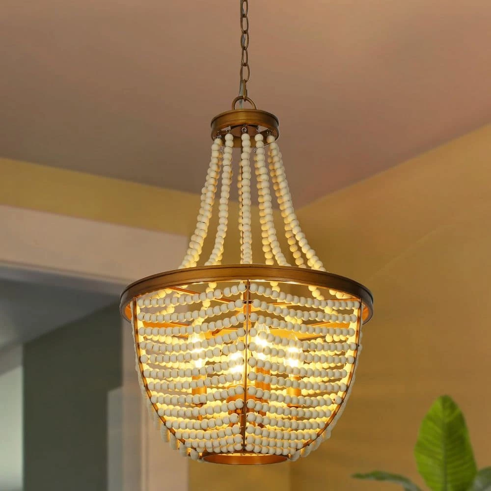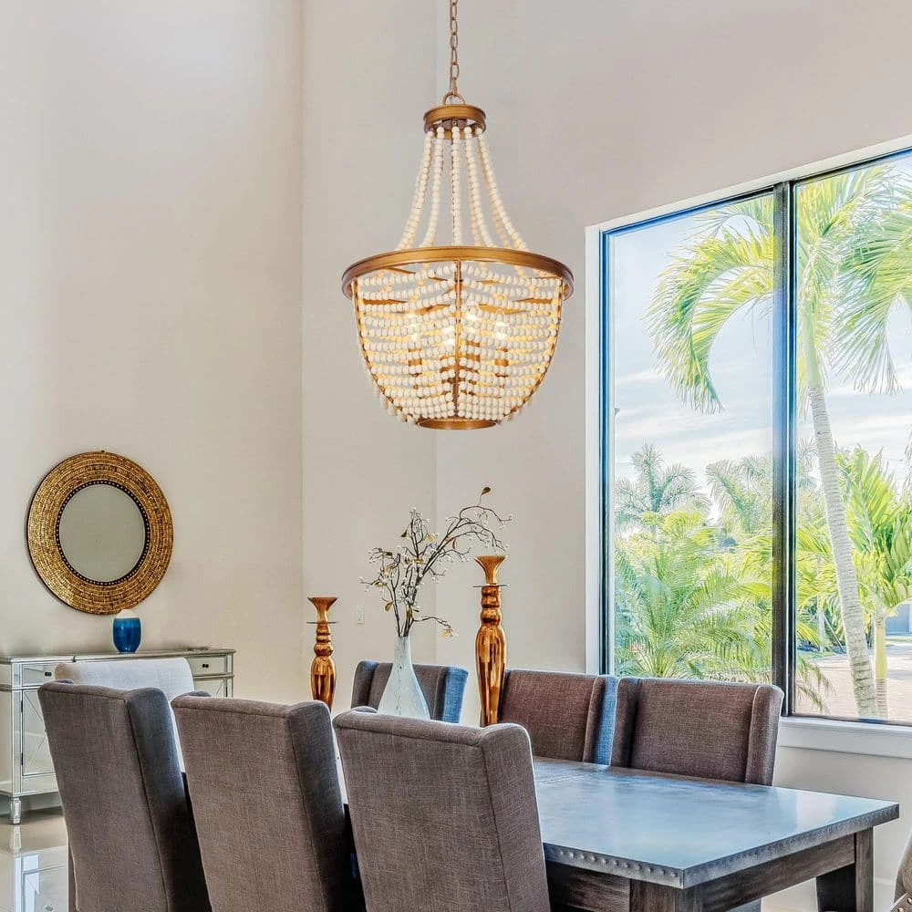 When this antique gold Island chandelier light by Uolfin Lighting is hung in your house, a nature atmosphere blows on your face. The gold color is used as the base of the whole lamp body, and the hand-made retro finishes, every inch of the lamp body has been carefully crafted, and the old brushed gold is telling the passing of time. The entire drum-shaped chandelier is surrounded by strings of wooden beads. If you are a retro suitor, this hanging light is a perfect match for you. If you are looking for such a wooden light in your bedroom, living room, kitchen, island, dining room, stairwell, or hallway, this old golden chandelier will be a versatile choice. Whether your home is a modern farmhouse, transitional, classic, cottage, or rustic style, it can be easily controlled.