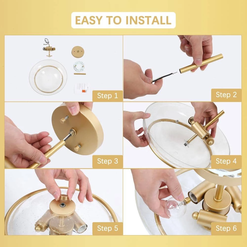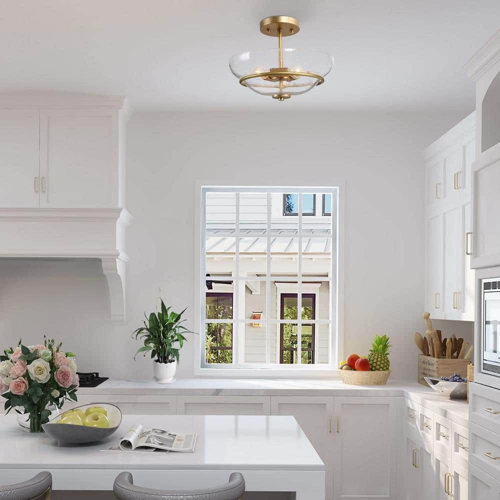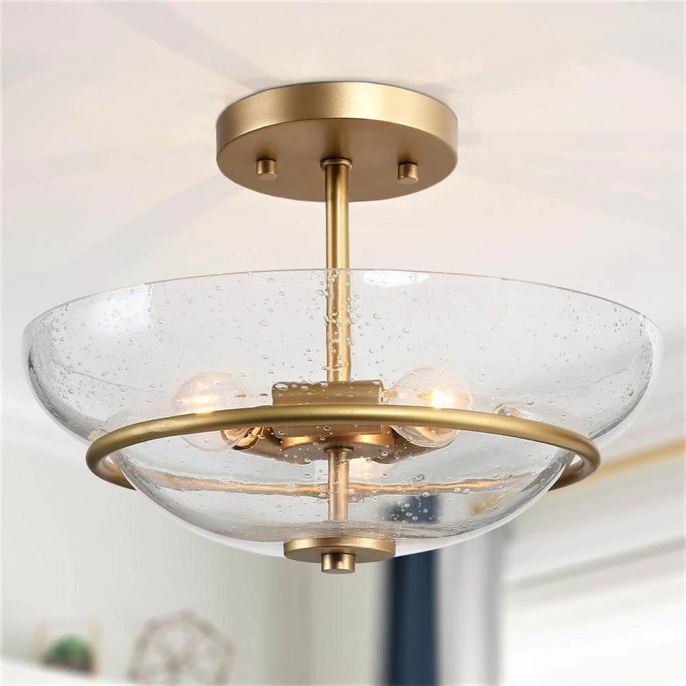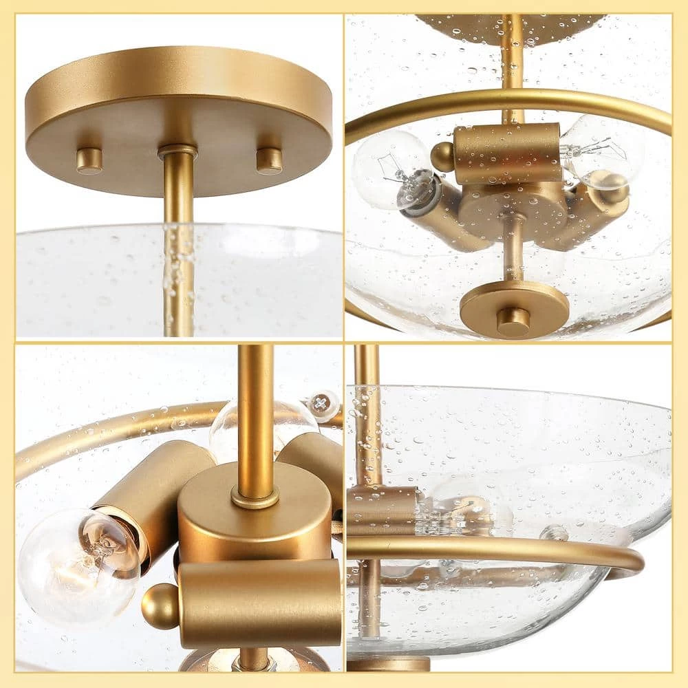 Light up interior space with this newly popular ceiling light from the Uolfin Gallum collection. The Center bowl shape design and seeded glass shade complement each other, creating visual beauty together. When lighting up the bulbs, lights pass through the shade, casting a wonderful glow, the brass gold color finish of the lamp body also shimmers. Benefited from 3 lamp holders which are arranged in a ring shape, the semi-flush mount light emits enough amount of illuminance, soft and warm. From the foyer, the living room, kitchen, dining room, and any other place, the sassy ceiling light updates your home decor.