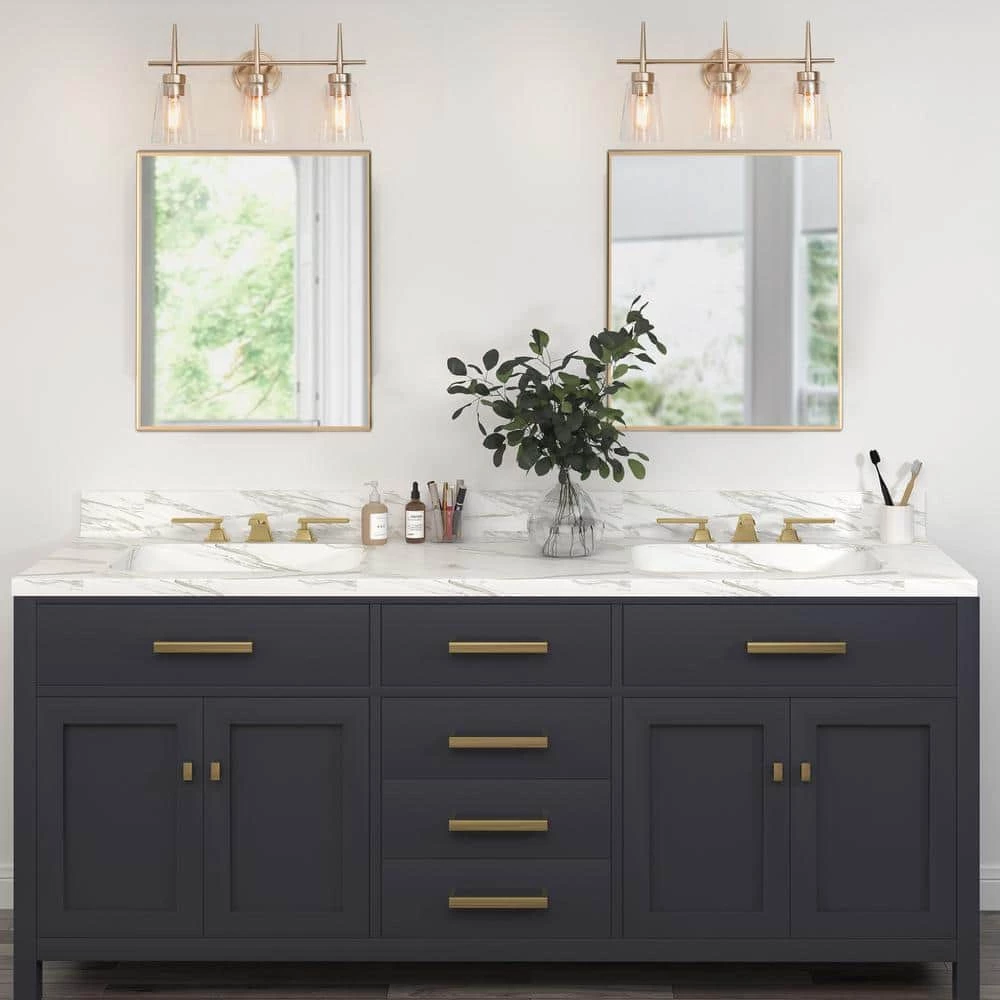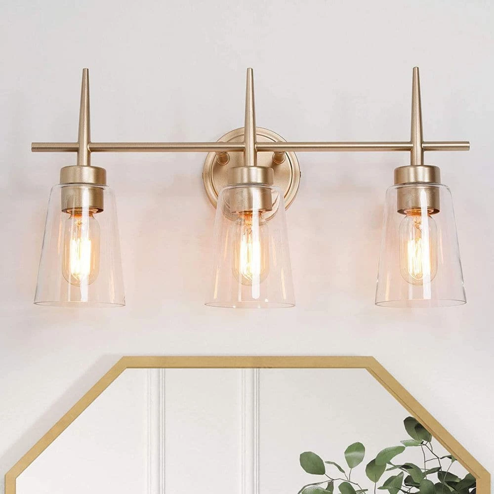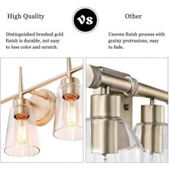 - MODERN BATHROOM VANITY LIGHT: Combining modern and industrial elements, this transitional vanity light uses a brass gold-plated finish, has a small round back panel and slender linear strips, and adds the element of a handbell, which is simple in shape without losing a sense of fashion
