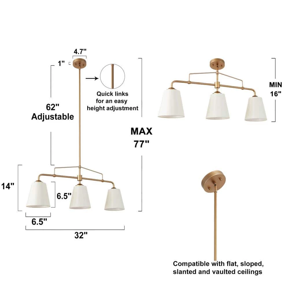 The 3-Light modern farmhouse island linear dining room chandelier from Uolfin Gold Series comes with a simple frame and 3 fabric shades. The Linear Shape Design is a better choice for the light source of the dining table or kitchen island. And this 32 in. large pendant light can meet your more-size tables, in addition to this, its fabric shades will bring a warm and romantic touch to your room. The versatile gold with elegant fabric can decorate your modern, farmhouse, transitional, classic, retro house. If you want to update your bedroom, dining room, stairwell, or living room, you can choose it without any hesitation.