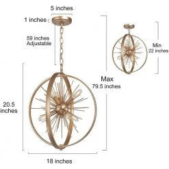 - Dimensions: fixture body 18.1 in. D x 18.1 in. W x 20.5 in. H, circle canopy 5 in. W x 1 in. H, adjustable hanging chain 59 in. L