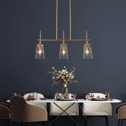 MITSUKI Brushed Gold Island Chandelier Hanging Light Fixture by Uolfin with its unique iceberg design, has received unanimous praise. Seedy glass shade offers the appearance of raindrops on the glass shade and makes the Modern Linear Chandelier, MITSUKI 3-Light Brass Gold Island Chandelier Hanging Light look like a melting iceberg. The pointed lamp holder and the straight edge of the lampshade give this MITSUKI 3-Light Brass Gold Island Chandelier Hanging Light with Bell Seedy Glass Shade by Uolfin a sharp silhouette. The Modern Island 3-Light Chandelier is wildly adopted in most decor styles, you can assemble the light in the kitchen island, dining room, living room, hallway, bedroom, and more, adding a modern appeal to your whole space.