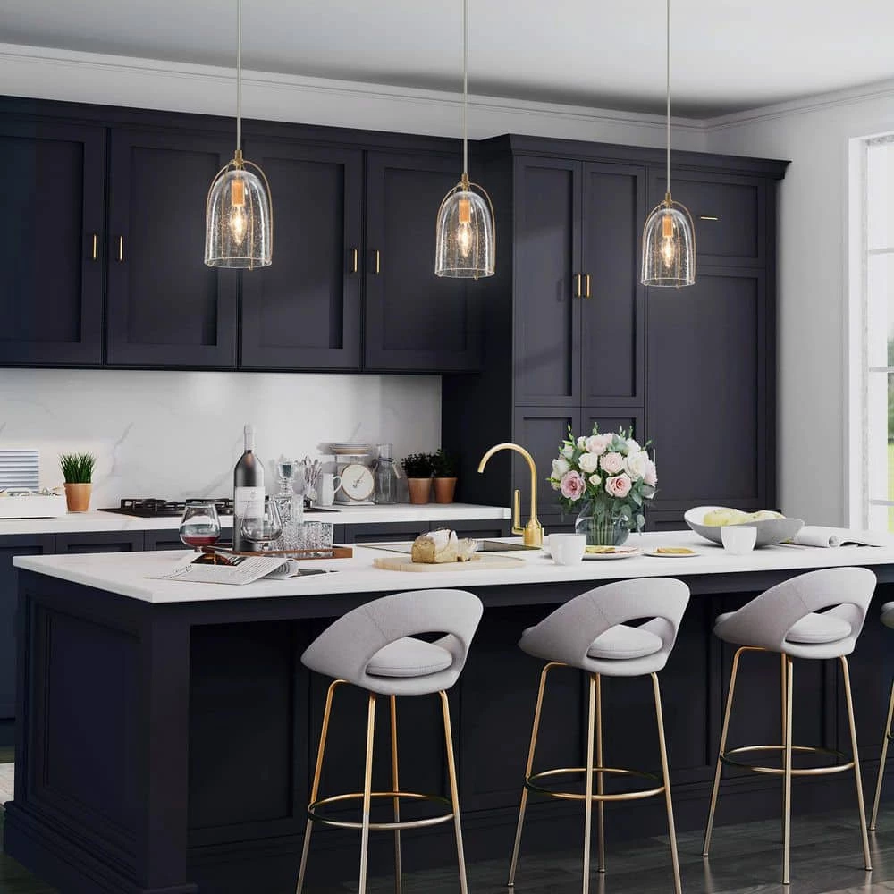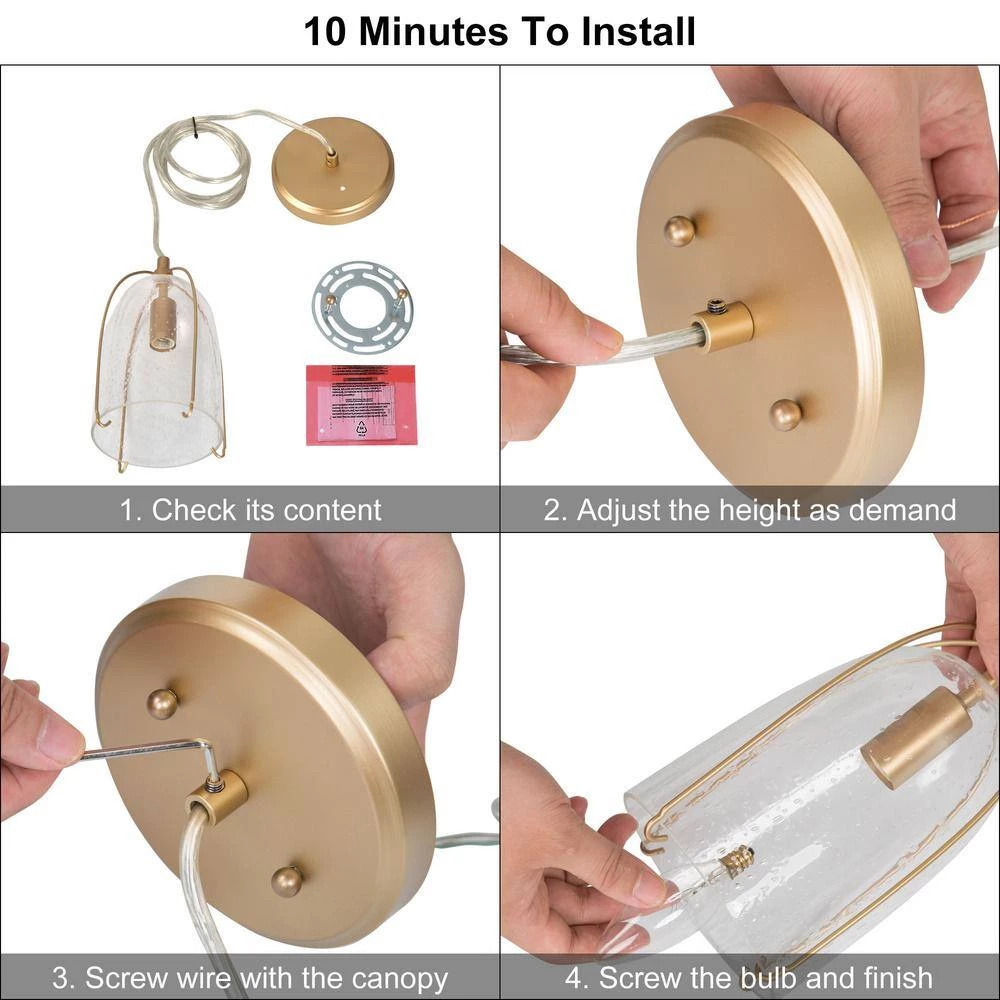 This classic lantern mini-pendant light by Uolfin Lighting features a metal caged frame with seeded glass shade negative space with a bulb that illuminates from within the center. Best fits in any transitional and modern home decor. The rose gold bell pendant light suspends from a power cord that is adjustable to allow the fixture to hang 15 in. down or up to 69 in. This bell mini-pendant ceiling light is suitable for your kitchen island, bedroom, living room, powder room, cafe, or bar. This gold cage mini pendant has a compact suspension height that can be adjusted, so you can DIY according to your inspiration. It can be singly, in pairs, or in multiple, with different suspension lengths to adapt to different sizes of space. Don’t miss the chance to completely refresh your house with Uolfin’s special offer.