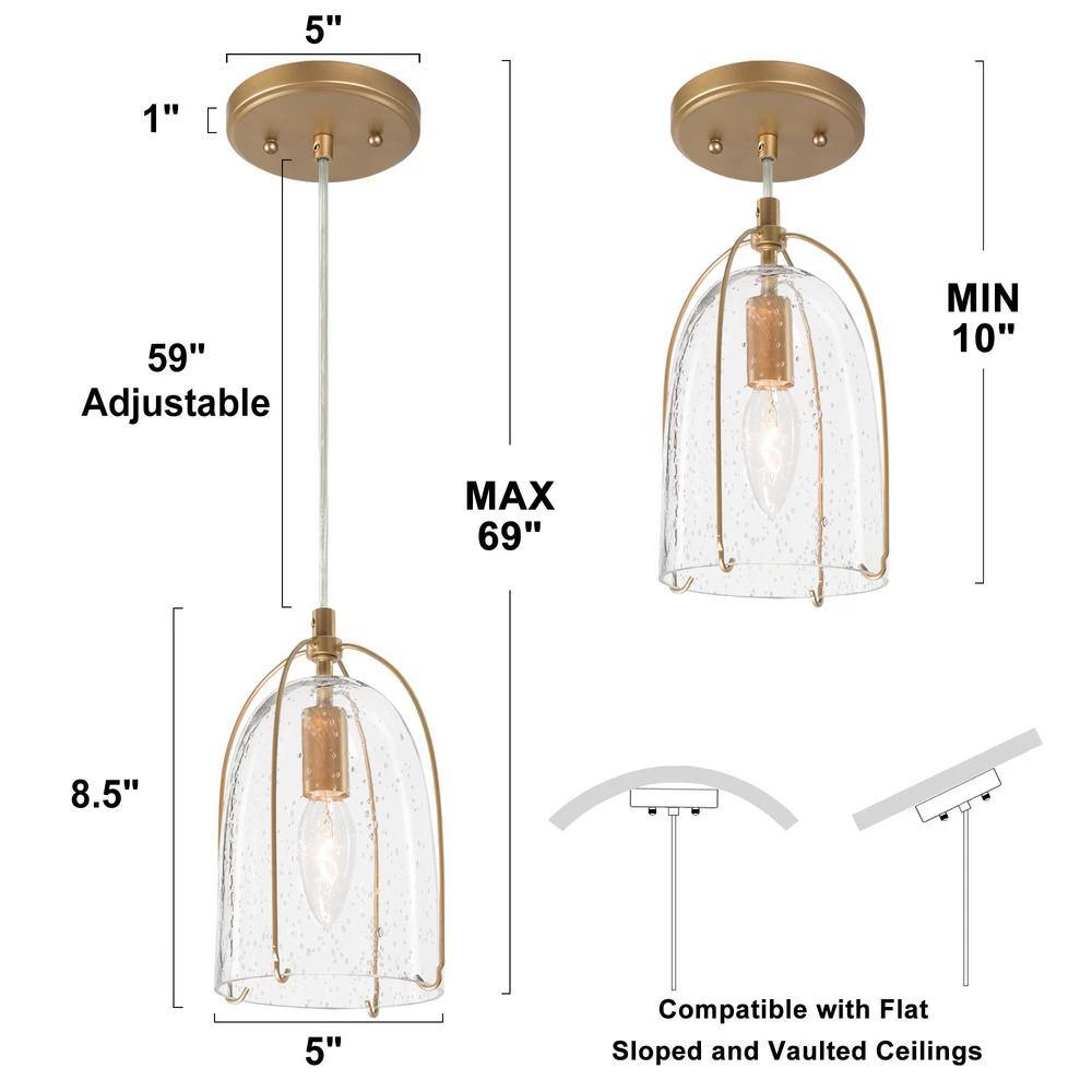 - Dimensions: overall measures 5 in. W x 5 in. D x 8.5 in. H, round canopy: 5 in. W x 5 in. D x 1 in. H, this 1-light gold pendant light fixture is ideal for the dining room, kitchen island, foyer/entryway, living room, laundry