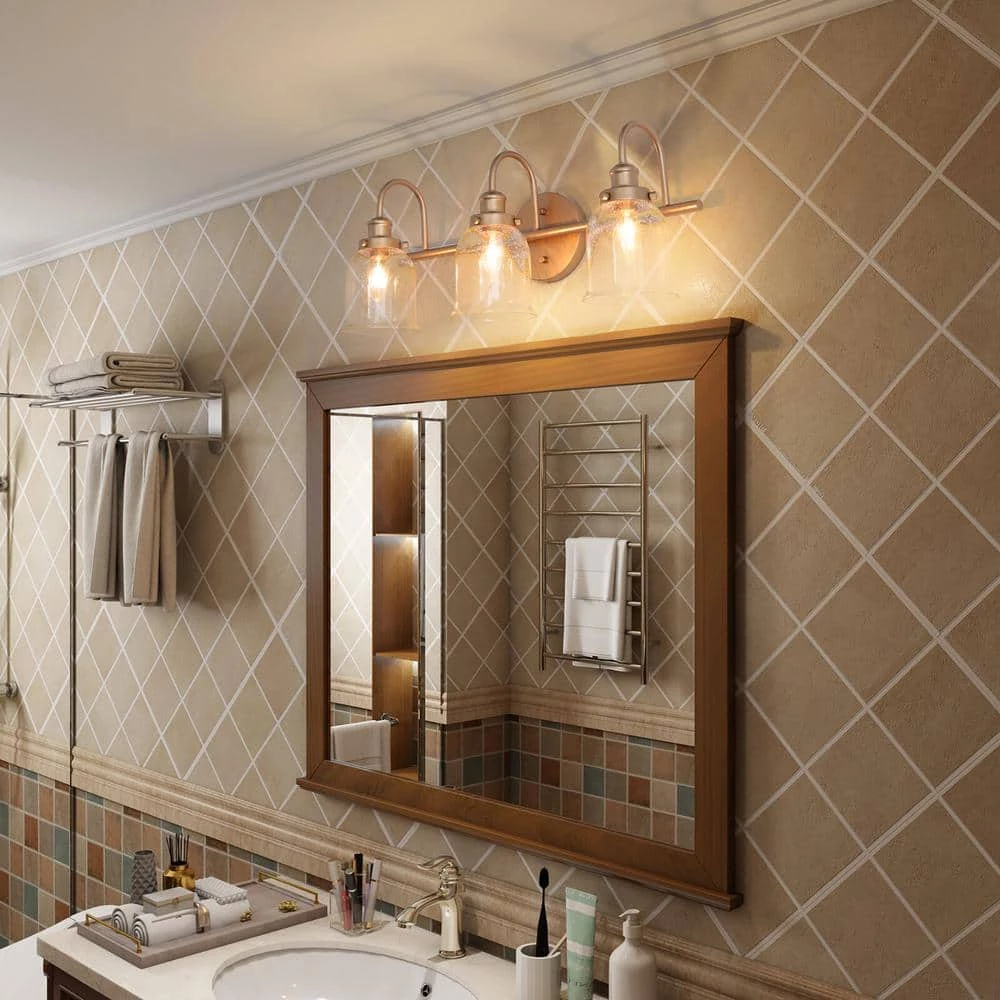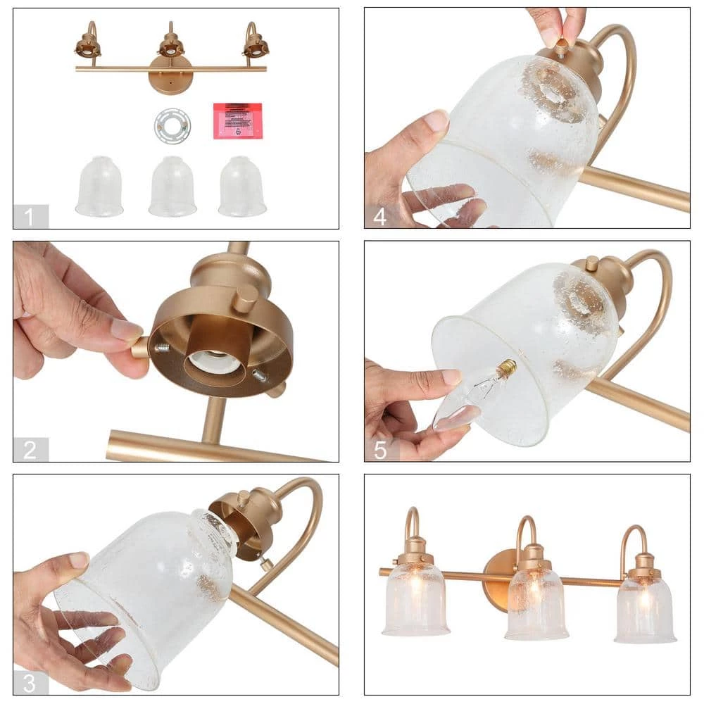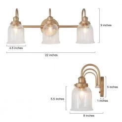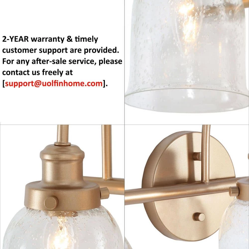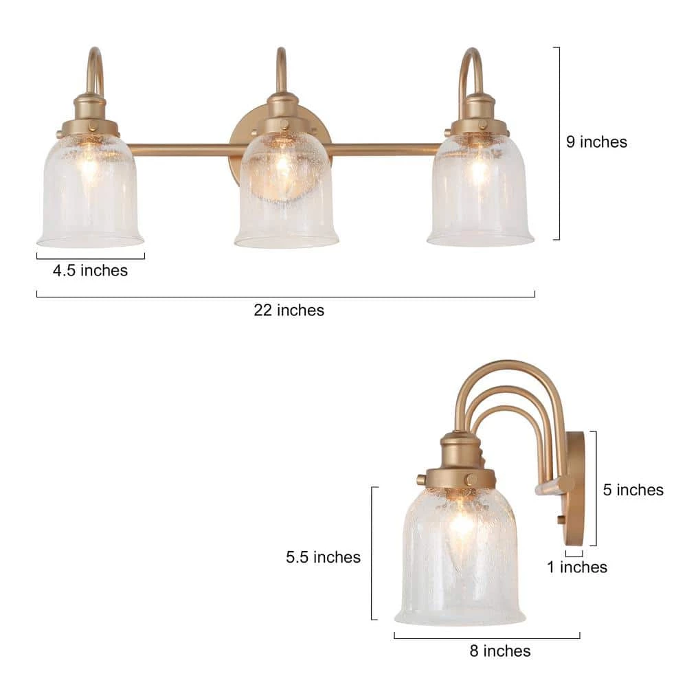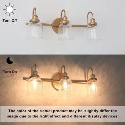 This Modern Vanity Light Deep Gold Bath/Wall Sconce by Uolfin has taken hold in today’s home interior light fixtures by offering clear glass shades for a fresh and clean look. The protective brass gold finish allows the filament-style dimmable light bulbs (not included) to play a part in the classic linear design and adds sophistication to this bathroom light. The bell/cylinder shades offer a pretty look and clear glasses radiate soft and warm illumination. The 22 in. 3-Light Brass Gold Mirror Vanity Light Fixture by Uolfin comes with completed hardware and all you need for an Easy installation to assemble the shades in the up or down position. Made from durable metal for long-lasting use in your home, the vanity light will be an eye-catching decoration of your bathroom, powder room, entryway/foyer, mirror cabinet or anywhere you like.
