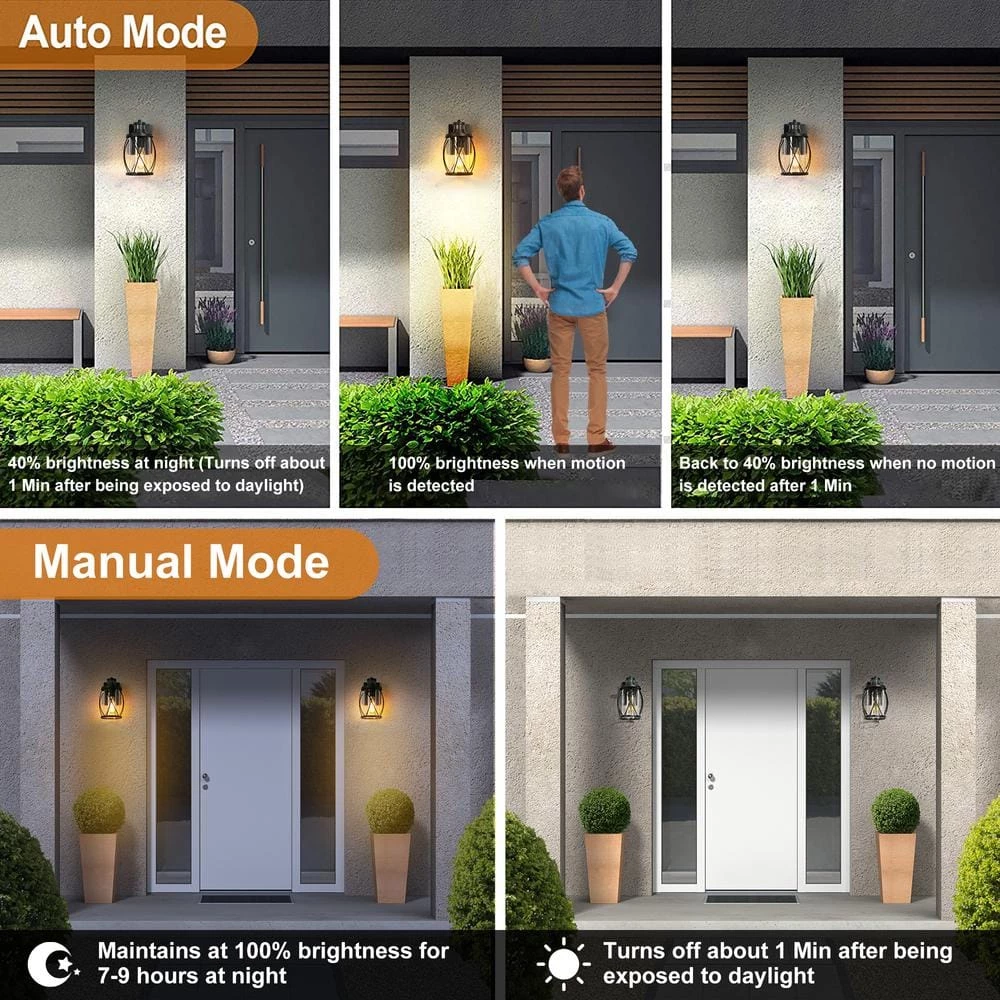 - 2 Working Modes: With a motion sensor, this outdoor wall light has 2 working modes, automatic mode & manual mode. In automatic mode, the light emits 40% illuminance at night, and when someone nearing, emits 100% illuminance, then back to 40% illuminance after serval minutes. While in manual mode, the light keeps emitting 100% illuminance. For a detailed description, please refer to the instructions.
