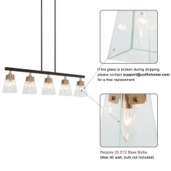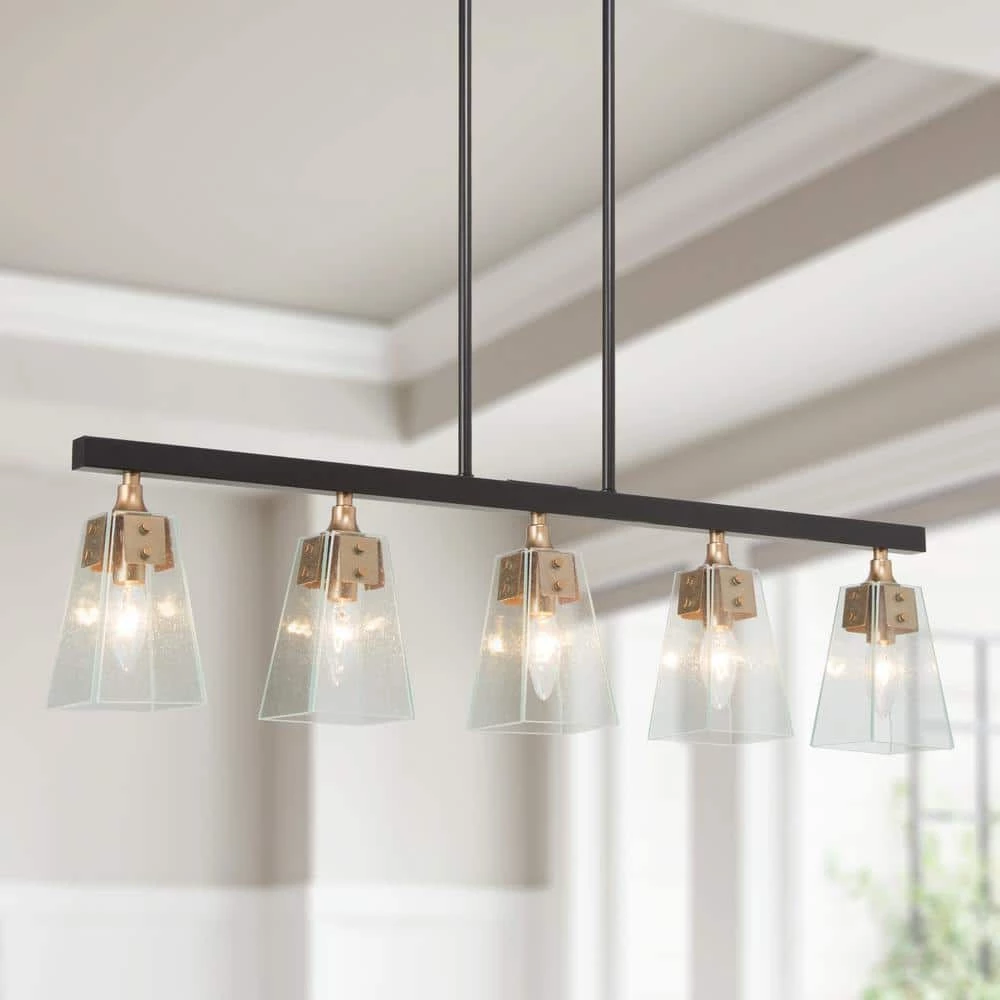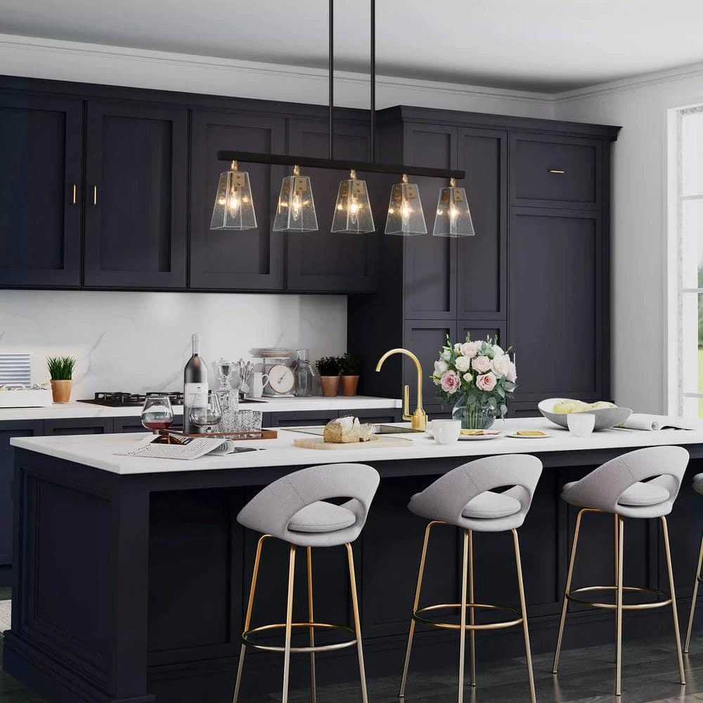Looking for a modern, elegant, and advanced design? This Uolfin black and gold 5-light chandelier will satisfy your lighting imagination, bringing you a double combination of plenty of light and beautiful decoration. When you want to update your home improvement, replacing such a modern light is the most convenient and effective method. A fun and fresh five-light island chandelier inspired by nautical accents. The open shade is popular in a variety of today’s home designs and is finished in a textured black and gold finish. This chandelier is a perfect selection for installations over kitchen islands and dining room tables. The geometric glass bell shades with popular black and brass gold embellishments upgrade your home decoration. Combining island design with minimalist industrial style, this black linear chandelier will perfectly match your charming space. Modern black gold chandeliers are widely used in most decoration styles. You also can assemble and hang them in the living room, corridor, bedroom, studio, etc., to add a modern and simple charm to your entire space.