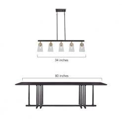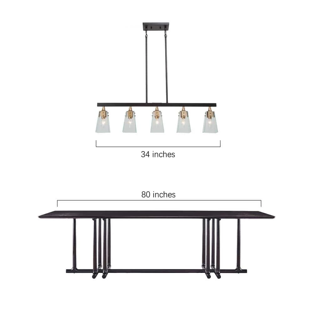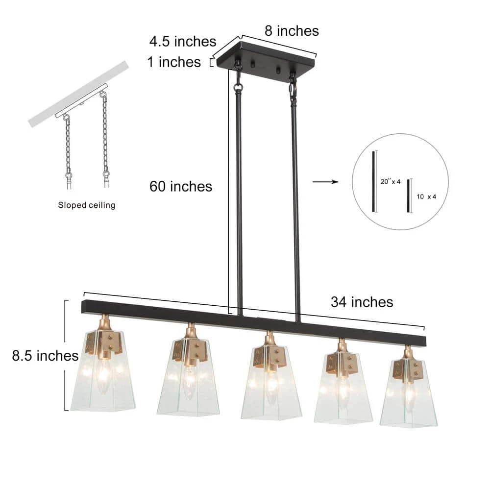 - DIMENSIONS: Overall measures 3.5 in. D x 34 in. W x 8.7 in. H, rectangle canopy 8 in. W x 1 in. H x 4.5 in. D, adjustable downrods 4 x 20 in. L & 4 x 10 in. L. This 5-Light Island Chandelier Light Fixture is ideal for the dining room, kitchen island,foyer/entryway and more