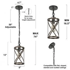 - DIMENSIONS: The fixture body of the Rustic Bronze Pendant Light is 5.9 in. D x 5.9 in. W x 13.4 in. H; circle canopy 4.7 in. W x 1 in. H; With a 59 inches chain, hanging height is adjustable up to 74 inches