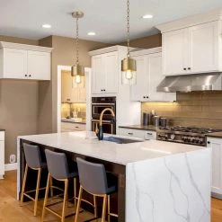 - BULB REQUIREMENT: This modern gold Island lighting fixture requires (1) E26 candelabra base maximum 60-Watt bulb, the bulbs need to work with a dimmer switch (sold separately). Rated for one 60-Watt incandescent bulb, 9-Watt LED bulb, 13-Watt fluorescent (CFL) bulb, or 9-Watt self-ballasted LED bulb, E26-base bulb