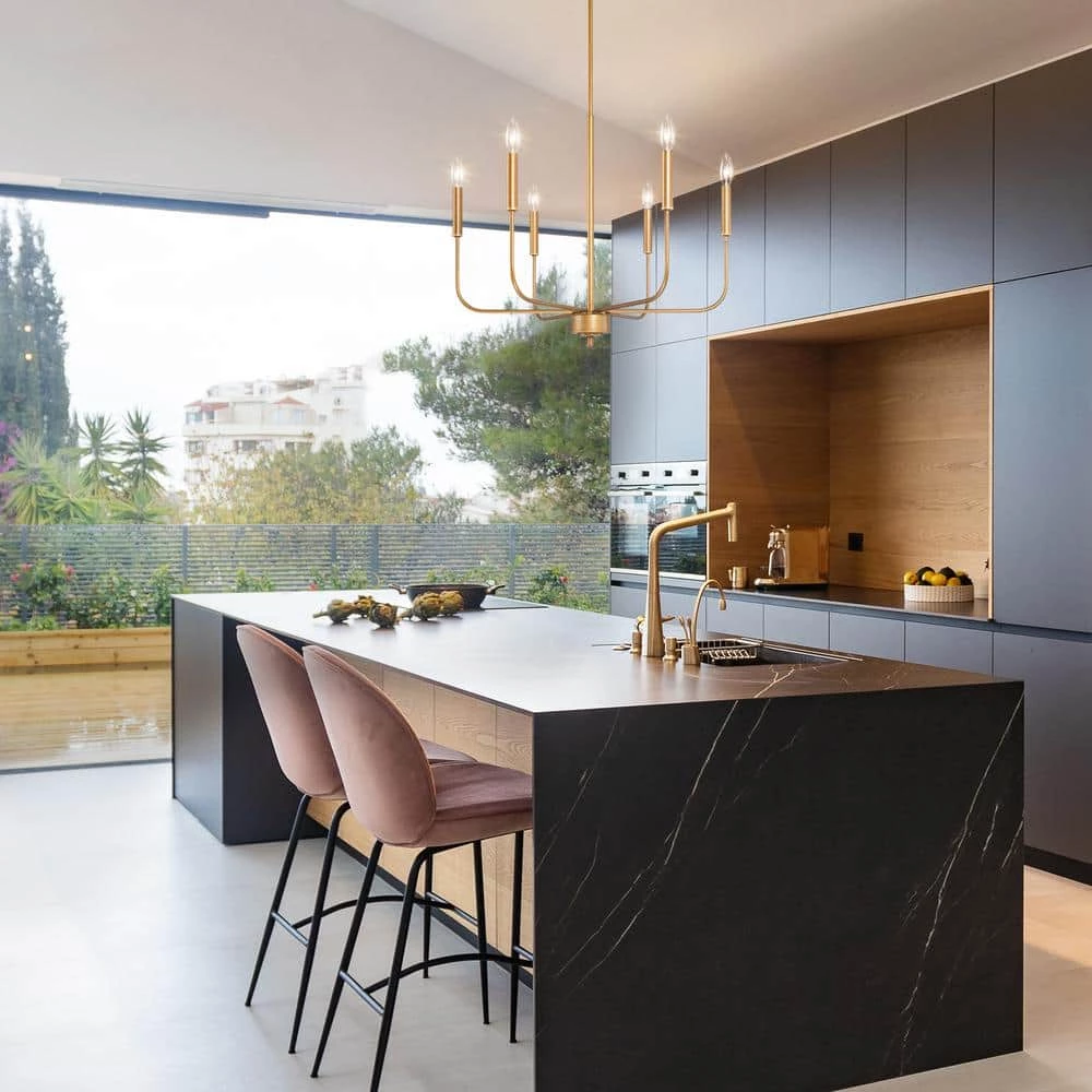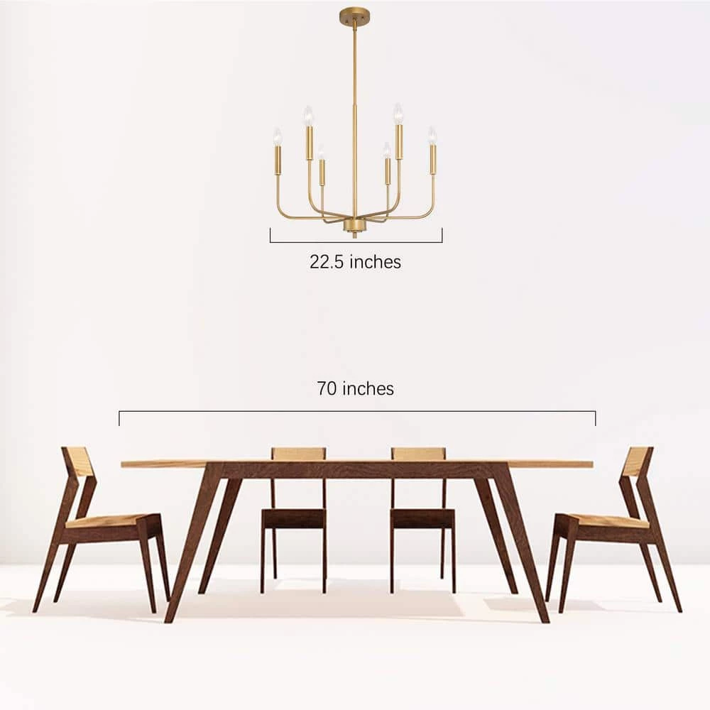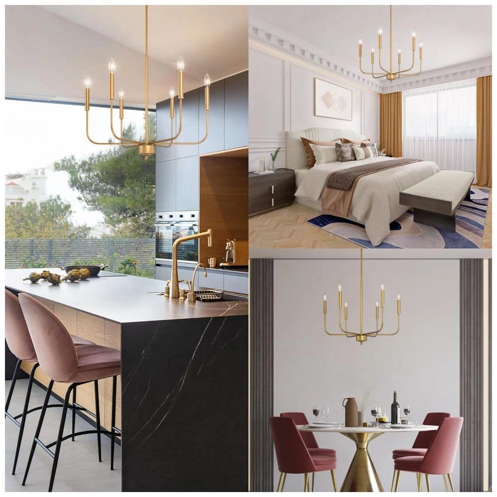 This vintage deep gold chandelier by Uolfin Lighting has a retro gold brushed finish for a graceful and round exterior, full of a rustic feel. If you hang it in your home, this golden chandelier can add a special atmosphere to your modern, farmhouse, cottage, mid-century, industrial or transitional house. The lamp body is bent upward by 6 branches to form a candle-shaped lamp holder. The simple design with fluent lines can be easily integrated into minimalist homes. Clean lines and a geometric exterior complete this classic chandelier and the simplicity doesn’t sacrifice the eye-catching aesthetics and generous appearance which shows your unique taste. The lamp arm can be rotated to adjust the angle you like, and the antique gold finish shows the taste of the homeowner. If your bedroom, kitchen, living room, dining room, stairwell, entrance hall, or guest room lacks such a lamp, this golden vintage chandelier will be a perfect choice.