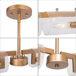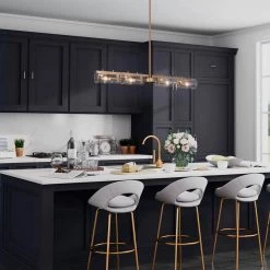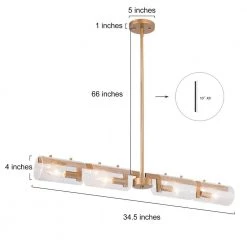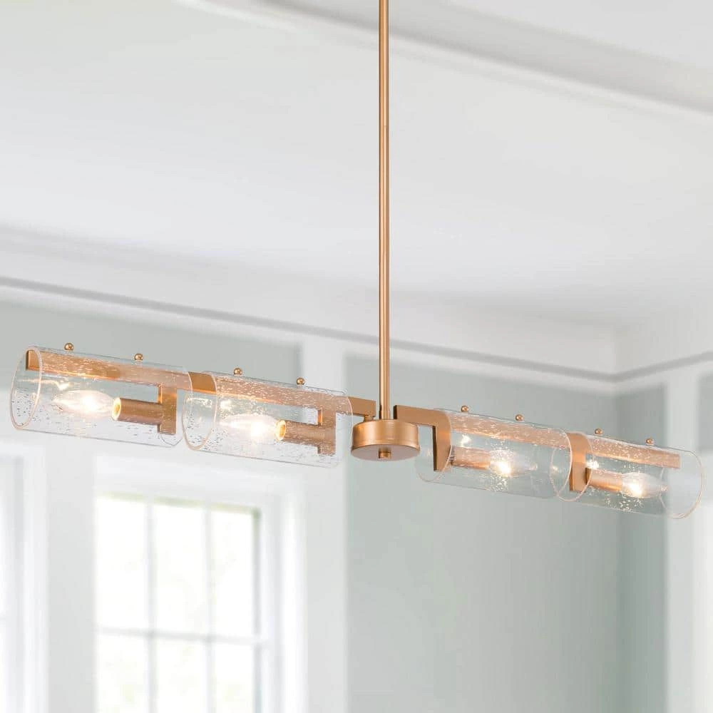 Taking a modern linear shape design, the chandelier is the best addition to your long dining table or kitchen island. Painted in a gold finish, the chandelier spreads a luxurious charm. And features 4 cylinder-shaped seeded glass shades shaped, when powered on, it casts a beautiful glow. The light body is 34.5 inches in width and requires 4 light bulbs (not included) when hanging over the kitchen island/ dining table the chandelier offers enough amount of illuminance.
