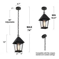 - DIMENSIONS: Fixture body 7 in. D x 7 in. W x 13 in. H, round canopy 4.7 in. W x 1 in. H, suitable for flat, vaulted, or sloped ceilings (Maximum Height: 74 in., Minimum Height: 16.5 in.)