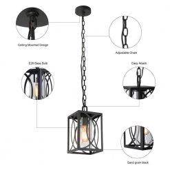 Capturing farmhouse design elements with an industrial look, the Modern Matte Black Outdoor Cage Pendant Light with Clear Glass Shade will gracefully appoint most home exteriors. Abandon complicated decoration, this outdoor pendant hanging light has a rustic modern aesthetic with a cage-shaped frame. Cylinder clear glass shade protects the bulb (not included) from dust and weather conditions. All parts of the pendant light are finished in a rich black finish that adds an industrial charm to this decorative outdoor light, transitioning comfortably from traditional farmhouse to modern industrial decors. Weather-Resistant for lasting durability, Open-Bottom for easy cleaning and bulb replacement, this outdoor light can reach the function that other outdoor lights do and even better. Perfect for mounting by the back door, by the garage or as part of a pair by the front entrance, this outdoor hanging light fixture will add light and flair to any outdoor space.