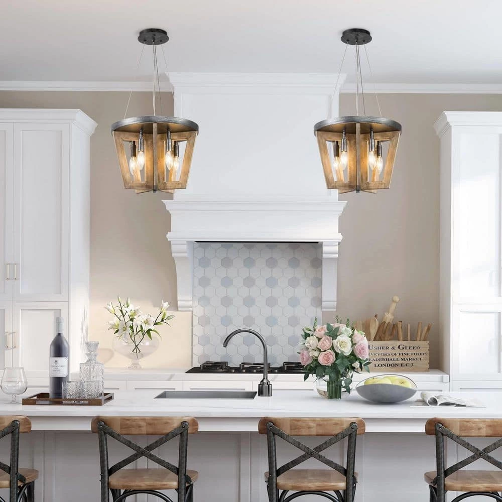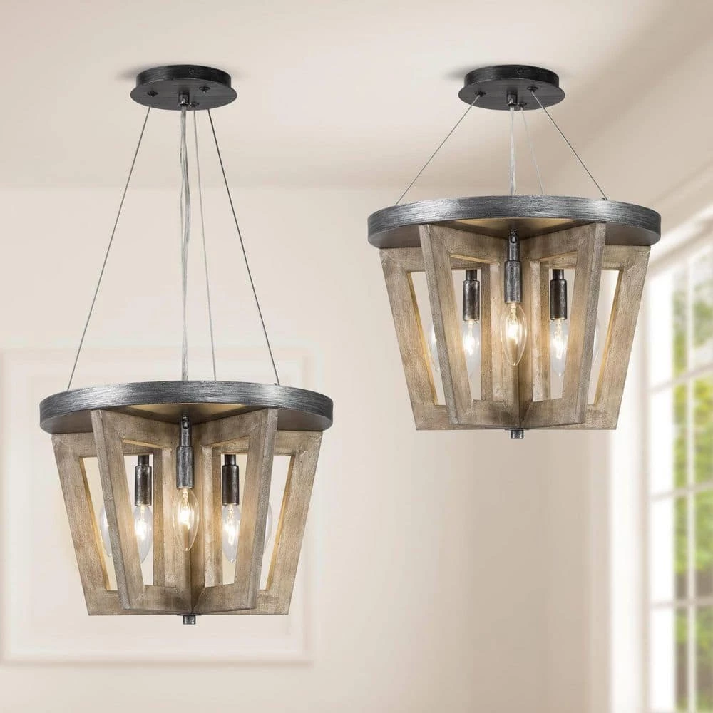 Make a statement with this handmade 5-light candle style hanging wood chandelier. This 14 in. W chandelier is perfect for transition or farmhouse decor styles. This real wood candle styled chandelier is perfectly made to combine elegance and minimalism, which results in timeless beauty. A luxurious piece for your dining room, living room or foyer. The hanging light suspends from 59 in. chain to 74 in. up or one 5 in. pipe allow the fixture to hang only 20 in. down.