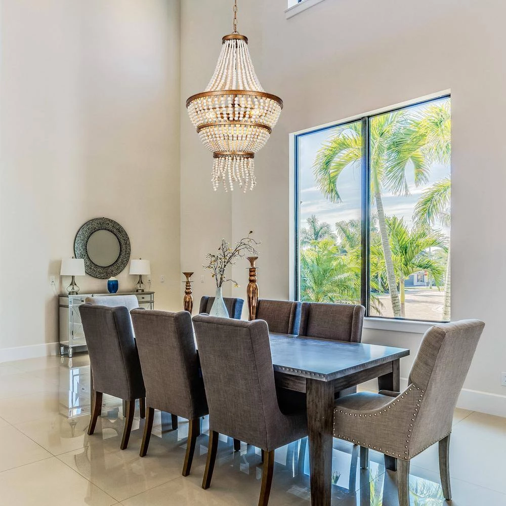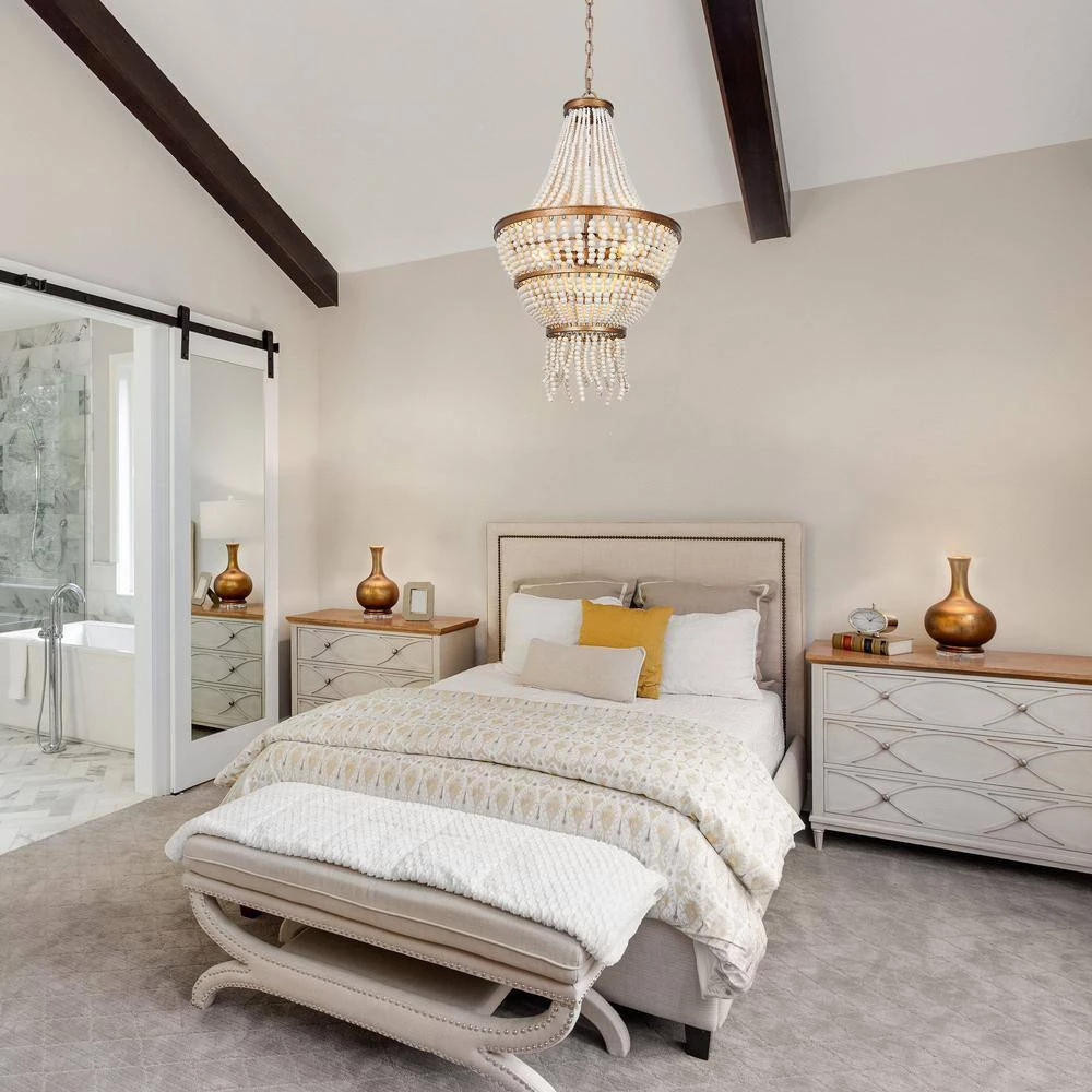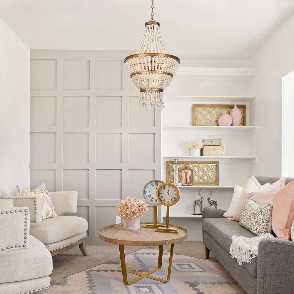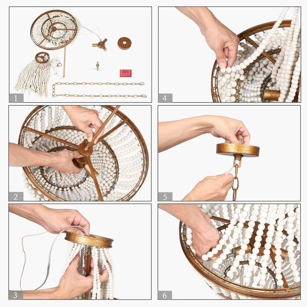 - MODERN FARMHOUSE BEADED CHANDELIER: The antique gold chandelier light features an antique gold body and handcrafted white wood beads shade to create a unique contemporary farmhouse boho style
