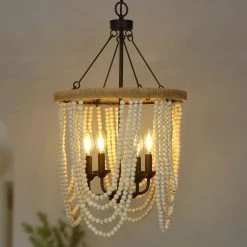 - DESIGNED DISTRESSED WHITE WOOD BEADS: With a unique shape, the hand-polished distressed white wood beads wrap around 4 candlestick-shaped lamp holders. When the light passes through the beads, it could create a beautiful light pattern on the wall and provide sufficient charming light for your living room, dining room, bedroom, and foyer