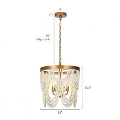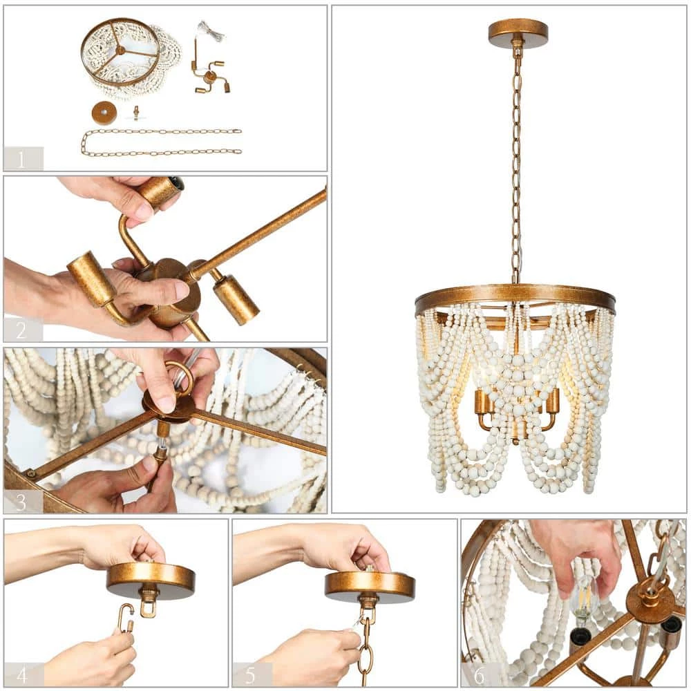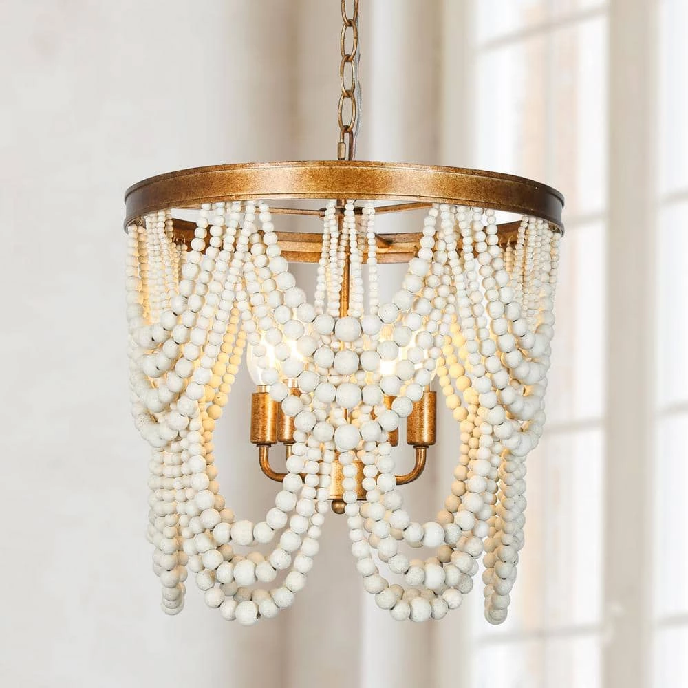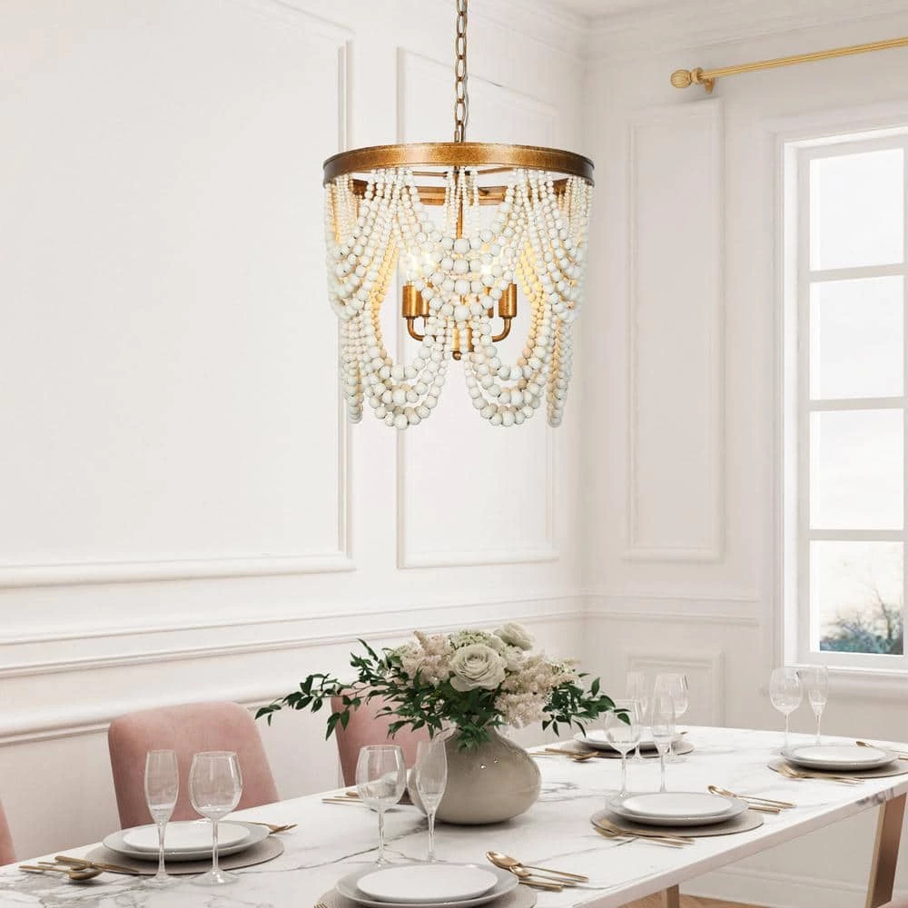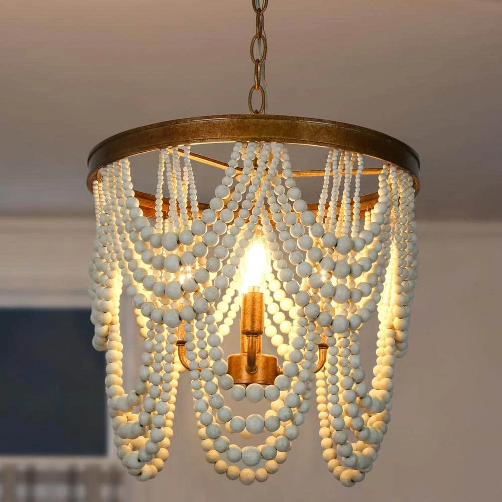 - MODERN FARMHOUSE BEADED CHANDELIER: The modern beaded chandelier light features an antique gold body and handcrafted white wood beads shade to create a unique contemporary boho style, the light source goes through the beaded shade to make a charming pattern to the wall
