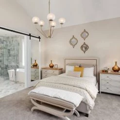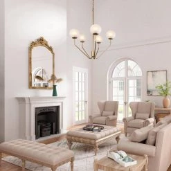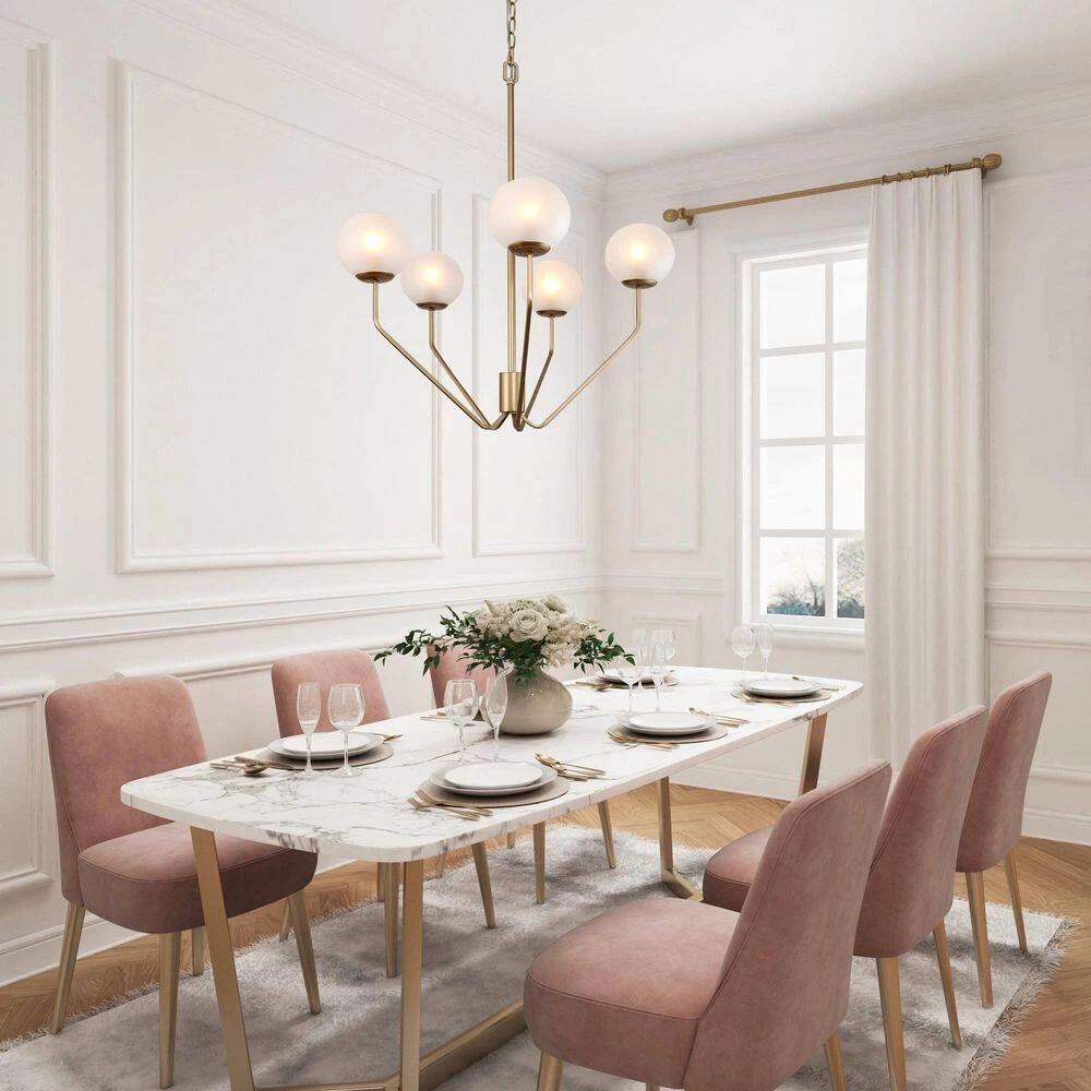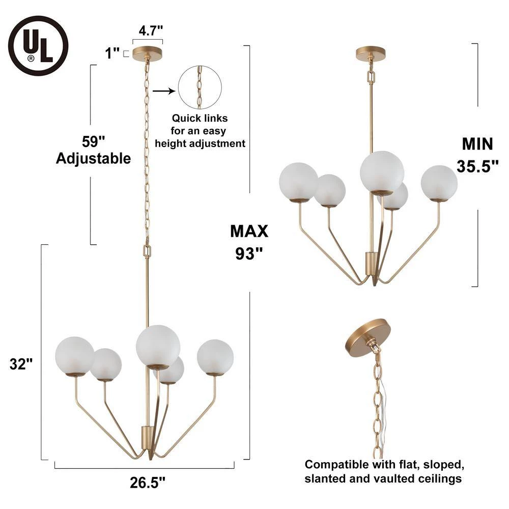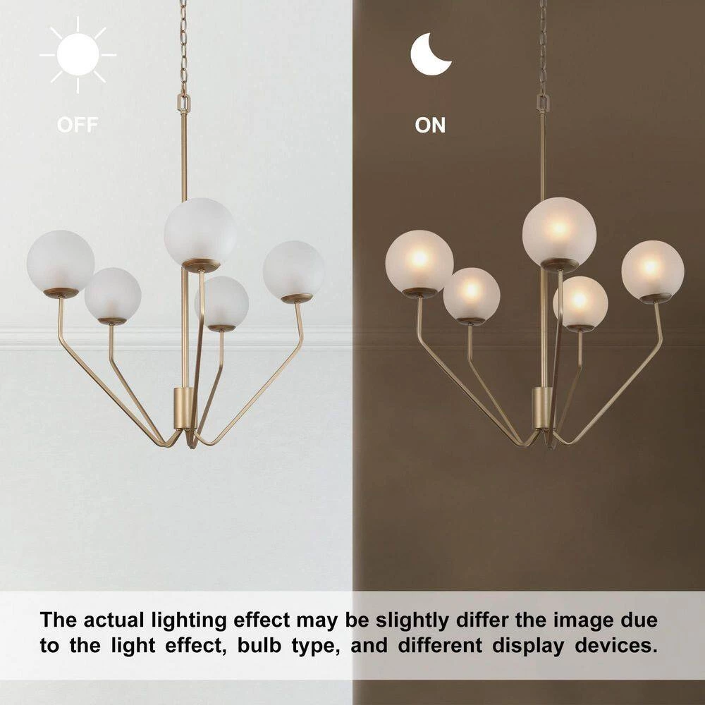 When this unique art-designed Modern Farmhouse Brass Gold Branch Chandelier by Uolfin Ray collection is hung above your room, the light becomes soft through the frosted glass lampshade, and it is sprinkled in every corner of the room, and everything becomes charming. The whole chandelier body uses gold as the main color, which is warm and elegant like sunlight, allowing this chandelier to easily blend into modern, retro, minimalist, transitional, and classic style home decoration. The gold chandelier body is connected to the round canopy by a 59-inch adjustable suspension chain, suitable for flat or sloped ceilings. In addition, its 5 globe frosted glass lampshades have a silky white gauze texture during the day when the lights are not on, and they get along well with your modern farmhouses, huts, and country-style children. The whole lamp has 5 lamp arms twisted into geometric branches, and the lampshade is like the fruit of a harvest. If your living room, bedroom, dining room, kitchen, island, entrance hall, stairwell, or guest room are looking for such a chandelier, this golden modern branches chandelier will be a good answer.