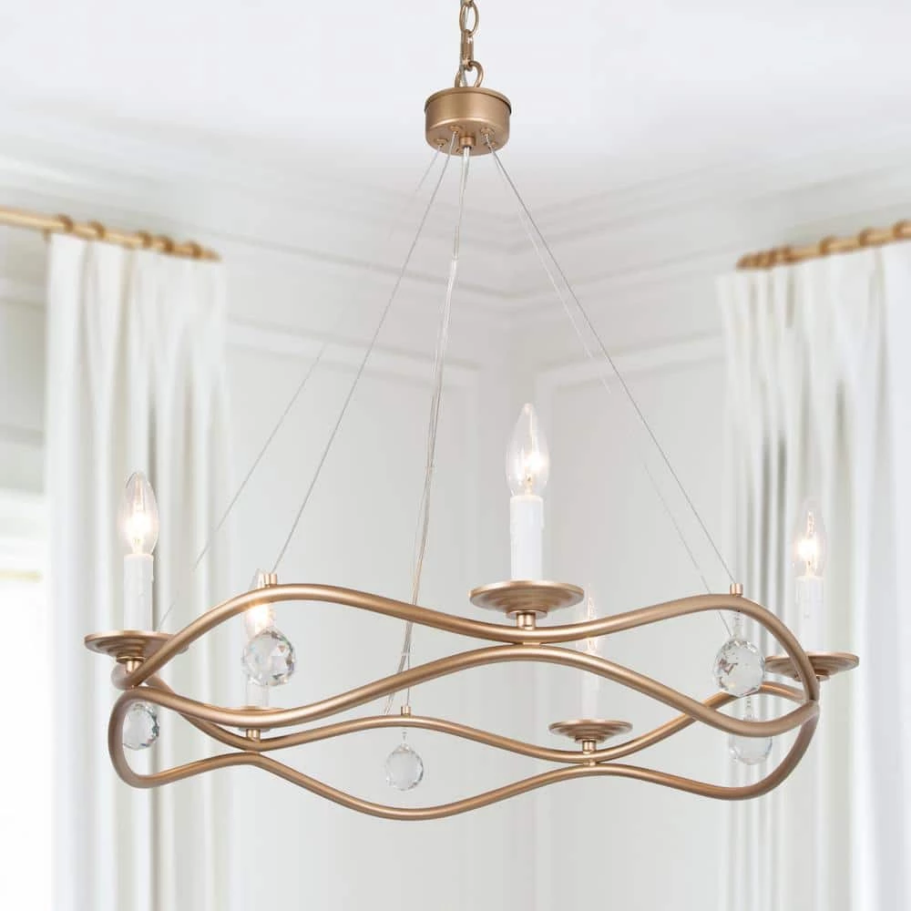 - MODERN FARMHOUSE CHANDELIER: Less is more with this sleek classic style gold chandelier. Uolfin’s 5-light brass gold transitional chandelier features 5 candle-style lights attached to the drum frame. The golden curves are combined like waves to form a perfect drum shape with a modern minimalist design