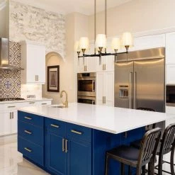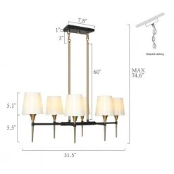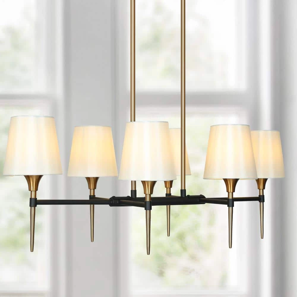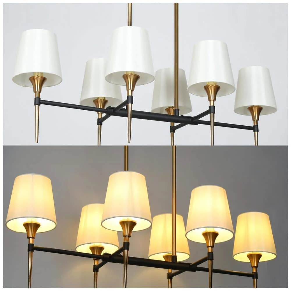 When The Modern Gold Candlestick Shaded Island Chandelier by Uolfin Lighting walks into your warm home, it will form a unique visual focus in your space and better decorate your space. The electroplated brass and black candle-shaped lamp holder is matched with white cloth shades. When the light is turned on, the brightness of the bulb (not included) will be softened by the white cloth shade, making your home more warm and cozy. The light body is connected by 2 adjustable hanging cords, suitable for sloped and flat ceilings. If you are looking for such a chandelier to hang on your kitchen island, dining table, living room, bedroom, dining room, foyer, corridor, or stairwell, this black gold chandelier will be a versatile choice.