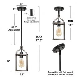 - DIMENSIONS: the fixture body of the rustic bronze pendant light is 5.5 in. D x 5.5 in. W x 11.8 in. H, circle canopy 5 in. W x 1 in. H, with (6) 10 in. downrod, hanging height is adjustable up to 75.5 in.