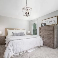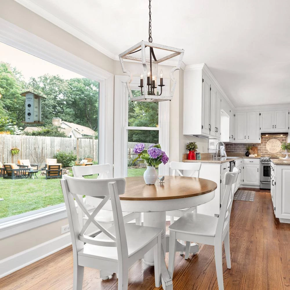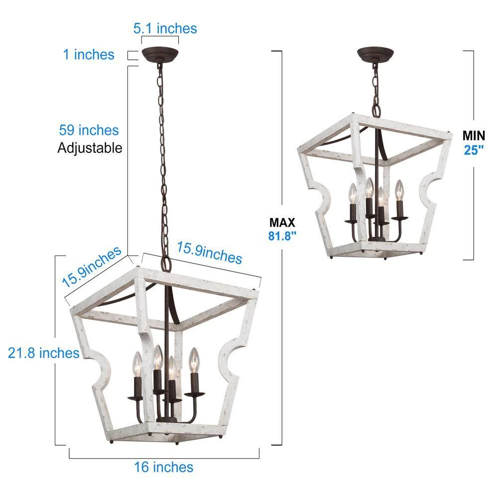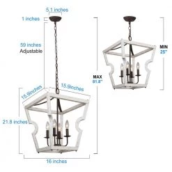 This Modern Farmhouse Weathered White Wood Island Chandelier is full of geometric design sense. The metal lamp holders and circle plates with a rust finish add perfect rustic lodge flair to the transitional decor. The retro feeling of this wood lantern chandelier would just remind you of those natural country days. The fixture body is connected to the round canopy by a 59-inch adjustable suspension chain, suitable for flat or sloped ceilings. The light radiates from the wooden hollow lantern structure, forming a perfect lighting function. Suspended individually, in pairs, or multiples, it is the ideal hanging light. Whether it’s in the kitchen island, living room, hallway, dining room, foyer/entryway, bedroom, or stairwell, it’s a great place to hang this classic chandelier light. If you are also a person who seeks warmth, rusticity, and quality in life, this transitional wooden chandelier is perfect for you.