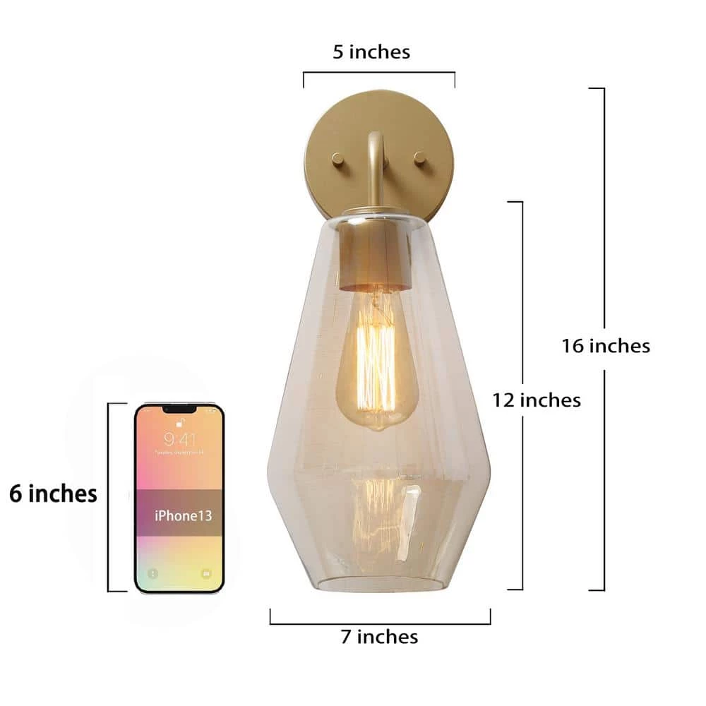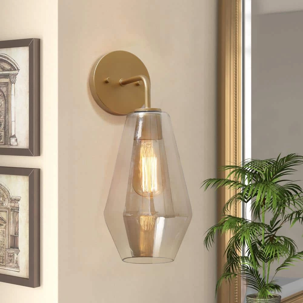 Incorporate urban modern style into your living space with this uniquely elegant 1-Light Brass Gold Wall Sconce Bathroom Vanity Light by Uofin Lighting, safely rated for damp locations. This sconce has a chic minimalist body with a round metal backplate and frosted, tapered smoked glass shade that lets the light shine through to illuminate your space. Whether you are searching for an event or retail lighting for a business space, or want to refresh your home’s hallway, bathroom vanity, powder room, bedroom, or living room, this transitional light fixture will help you distinguish your style.