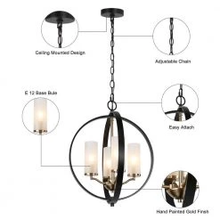 Modern globe chandelier from Uolfin Lighting adopts a special ring shape design, 2 circle loops consists the mainframe of this island chandelier light, decorated with a fascinating black and brass finish, updates interior decor into a modern style. 4 lights and 18.1 in. size endows outstanding lighting function and wide applications to this trendy light fixture, not only over the dining table, kitchen island, the living but also any places you prefer, the chandelier pendant light perfectly suits. Such a modern chandelier is the best choice to upgrade your home decor.