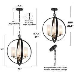 - DIMENSIONS: fixture body 18.1 in. D x 18.1 in. W x 20.1 in. H, circle canopy 4.7 in. W x 1 in. H, adjustable hanging chain 59 in. L