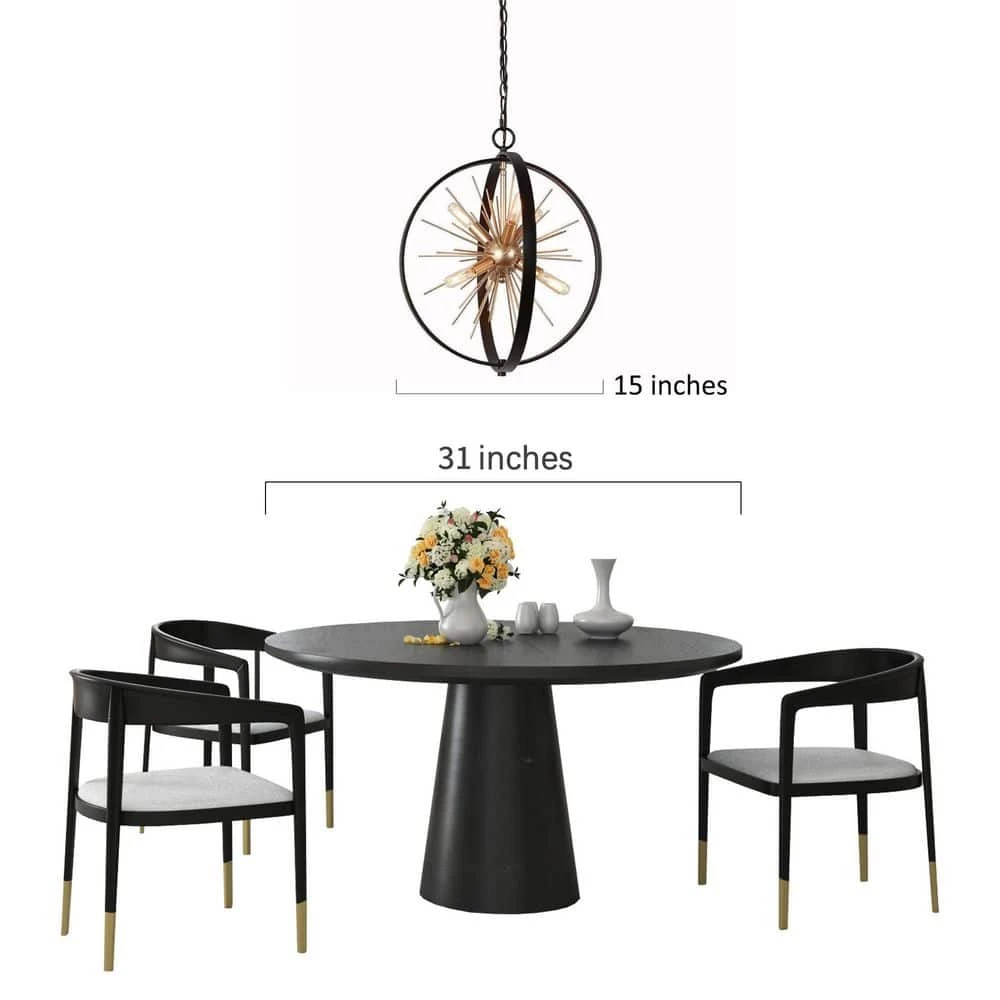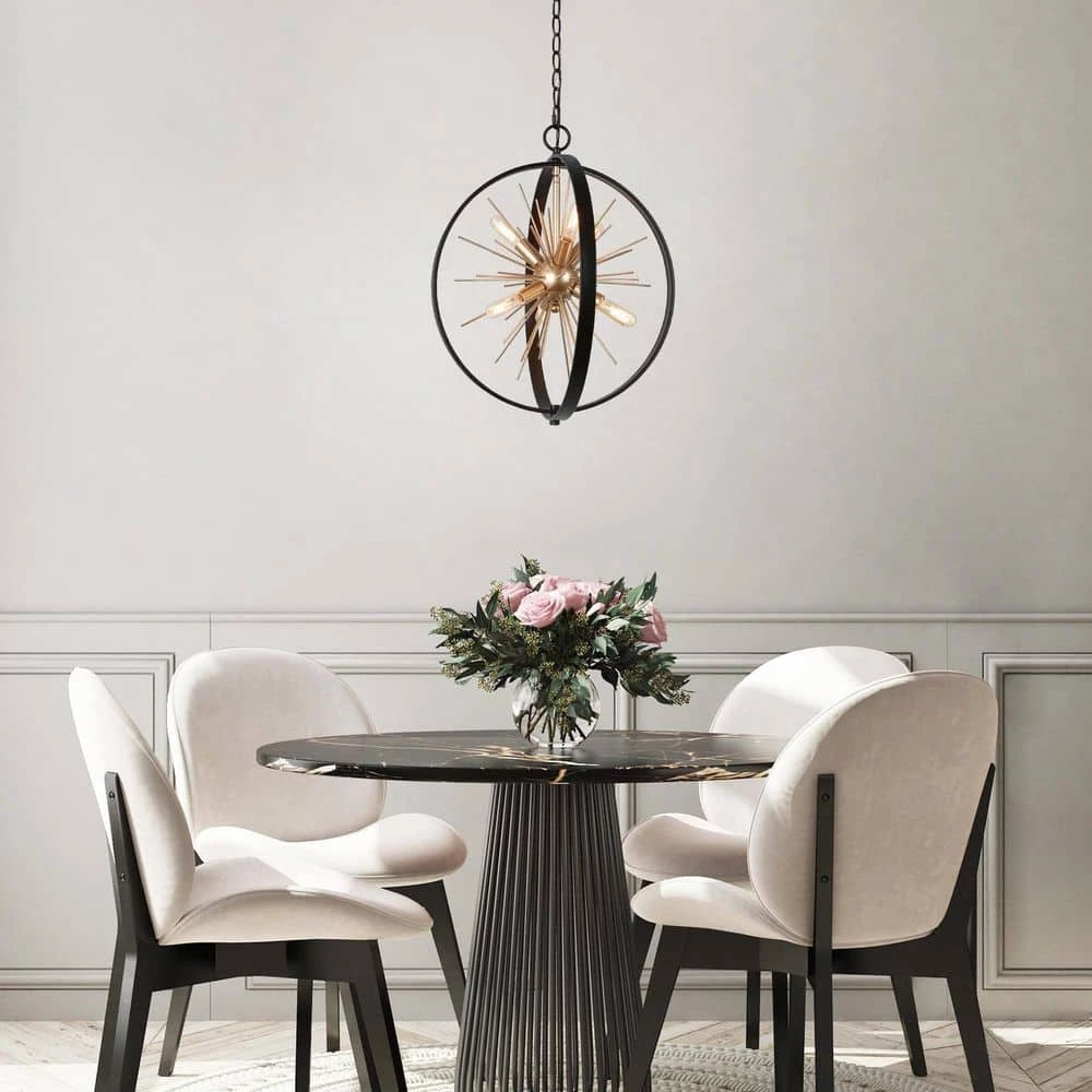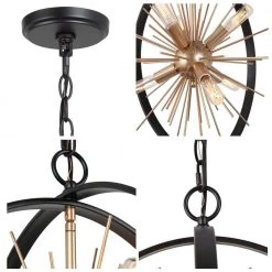 Breaking regular impressions on the chandelier, and adopting the modern aesthetic concepts in design, this modern chandelier by Uolfin Lighting set off the wave of revolution in modern home decor. The mainframe of the chandelier light consists of 2 circle rings which take a matte black finish and are staggered into a sphere, surrounding the lamp holder. Gold strips spread out from the lamp base like a starburst, which is inspired by fireworks. With 6 light bulbs (not included) facing all directions, the chandelier light offers a super bright light that fills up the whole room. The chandelier light can be widely applied in various scenes, including the dining room, kitchen, living room, bedroom, and so on.