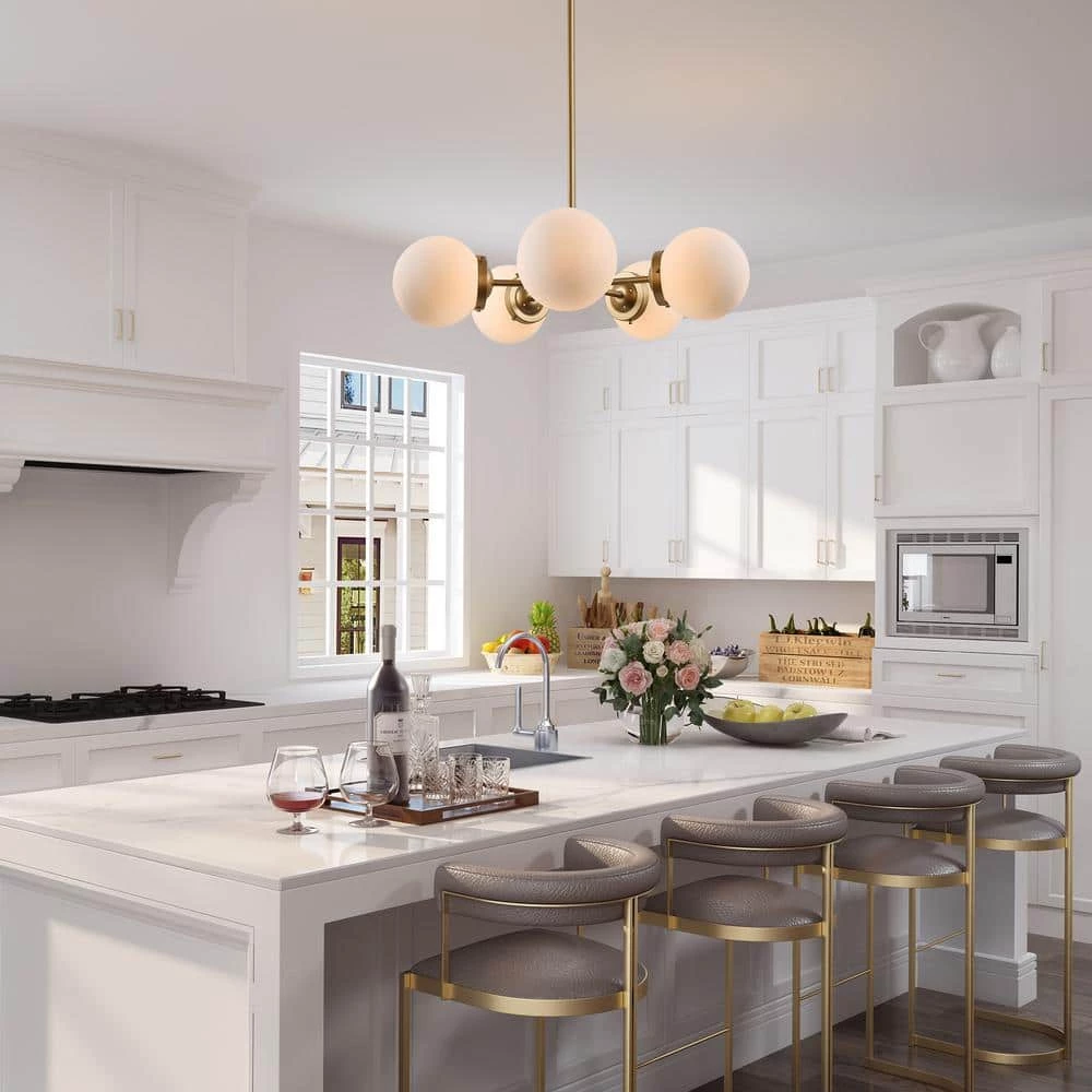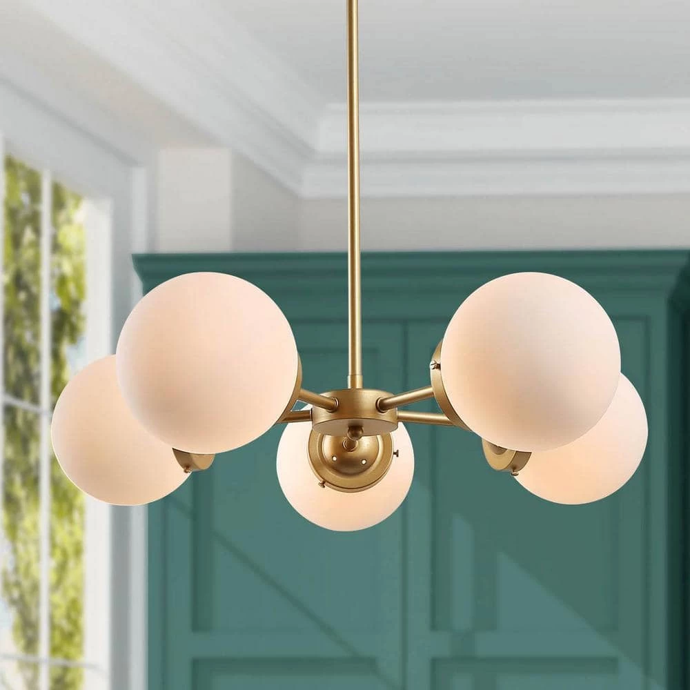 A wide range of illuminate, soft & warm rays, classic color finish, multi ways of installation. All demands are satisfied with this sputnik chandelier light from Uolfin Lighting. 23 inches in width and works with 5 light bulbs (sold separately), this modern chandelier spreads lights to every corner in the space. Frosted glass shade which is handmade emits soft & warm lights. Beautiful champagne gold color finish visually contrasts with the white jade lampshade, but it won’t look uncoordinated. Six 10 inches poles included, so hanging height changes from 17 to 67 inches, you can choose your ideal way of installation. Such a light fixture deserves to be regarded as a masterpiece, will be a dazzling part of interior decoration.