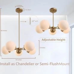 - MULTI WAYS OF INSTALLATION: Allocate with 6 separate hanging poles, and depending on the quantity get used, this gold light fixture can be used as a semi-flush mount ceiling light, or a modern chandelier lighting.