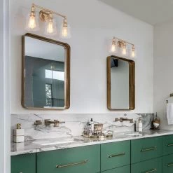 - MODERN BATHROOM VANITY LIGHT: Combining modern and French country elements, this transitional vanity light has a brass gold finish, a small round backplate, and slender lines. The hand-bell element is added to the glass shade to highlight the simplicity and fashion, and it also adds a Christmas touch
