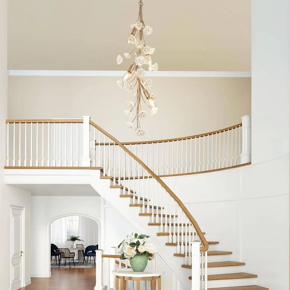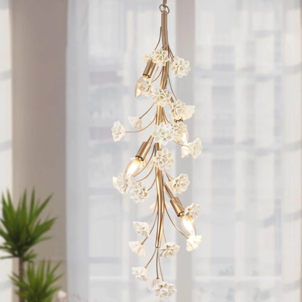 This Uolfin modern gold linear bedroom chandelier with white ceramic flowers brings you a different kind of lighting new enjoyment, in addition to the function of lighting, more amazing is her decorative effect. When it pours down from your ceiling, it looks like a vine with full blooming flowers hanging down. When you hang more lights in your room, nature seems to follow and live in your house. Follow Uolfin Lighting to decipher modern lighting trends and choose subtle designs that refuse to be ordinary. If you are looking for a light source for your charming kitchen, living room or bedroom, this golden chandelier is the perfect choice.