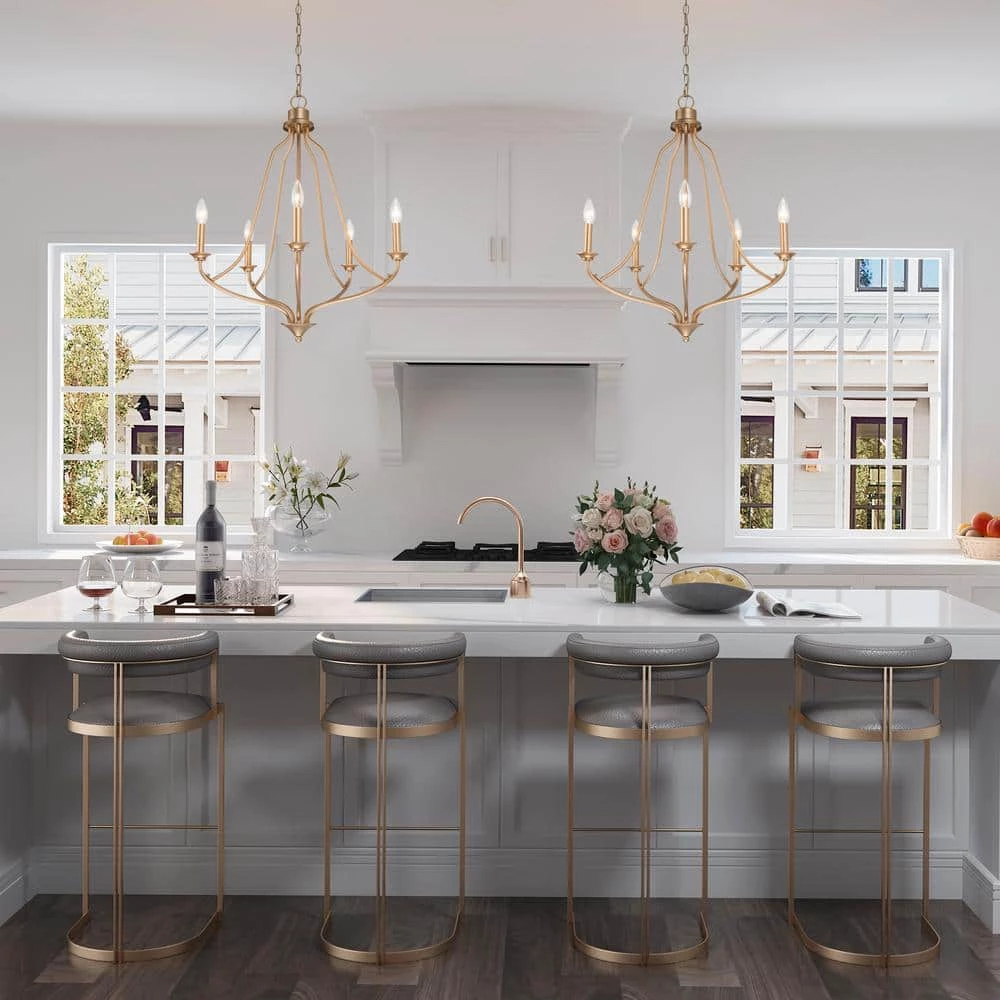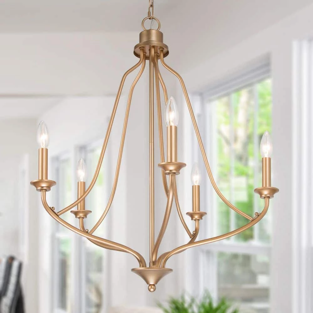 This modern farmhouse island gold chandelier light fixture by Uolfin Lighting is a perfect combination of modern design, perfect for adding simple and elegant charm to your charming kitchen island, foyer/entryway, living room, bedroom, etc. Refined from strong metal, its brass finish creates an instant romantic atmosphere for your space, and it can easily adapt to various home decorations. This 5-light champagne gold empire modern chandelier lighting is equipped with a 59-inch adjustable chain that can accommodate multiple ceiling heights. Whether in the countryside or in a busy city, this popular rose gold candlestick holder light can perfectly blend into your retro, classic, minimalist, industrial, cottage, or villa-style interior decoration to add modern charm. Listed by UL, it has proven durability without compromising functionality and aesthetic value.