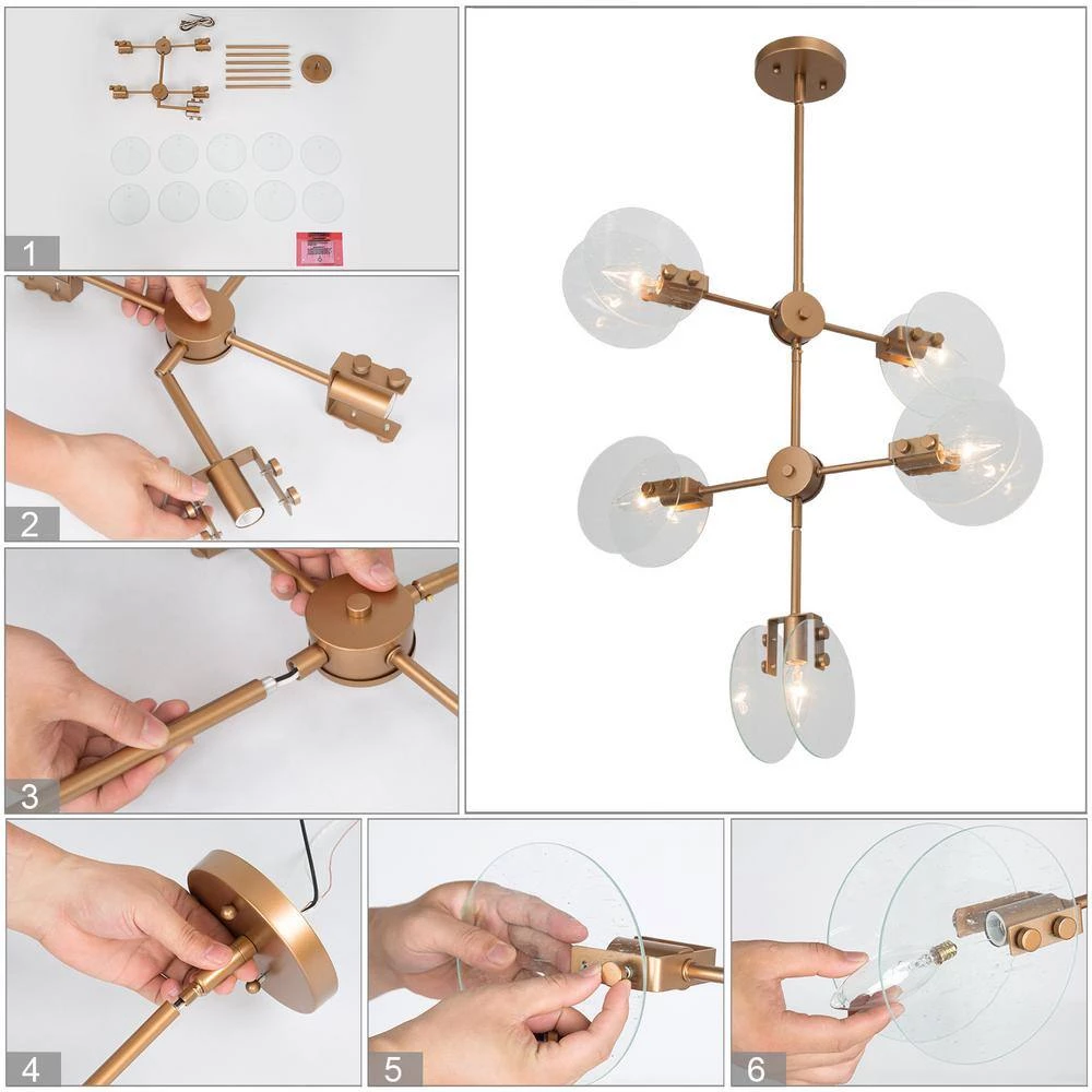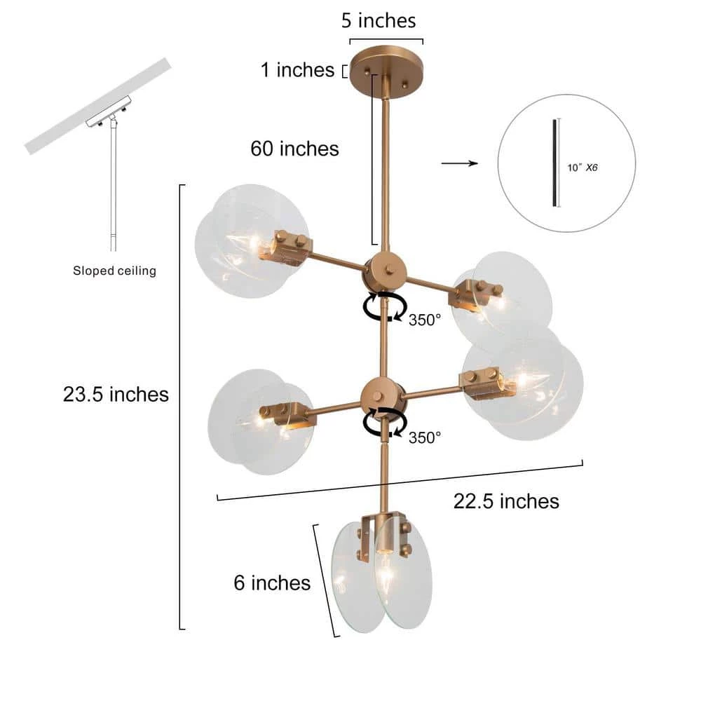 - ADJUSTABLE HANGING LENGTH: This golden chandelier has a 60-inch pole composed of six 10-inch poles. The longest hanging length can reach 84.5 inches. You can change the suspension height by changing the number of rods