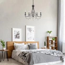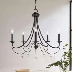 Gracefully curved lamp arms, rustic matte black color finish, shimmering crystal pendant drops, all the beauty gathered on this Uolfin modern candlestick chandelier light. Trendy but classic, the two styles perfectly combined, embellish modern interior decor. Compatible with a 59 inches chain as a hanging fixture, hanging height is completely adjustable from 28 inches to 84 inches, can be installed for nearly any roof conditions. From the modern, farmhouse, industrial, traditional, and various home decor themes, this simple designed chandelier light is widely applicated, refreshing your home with chic charm.