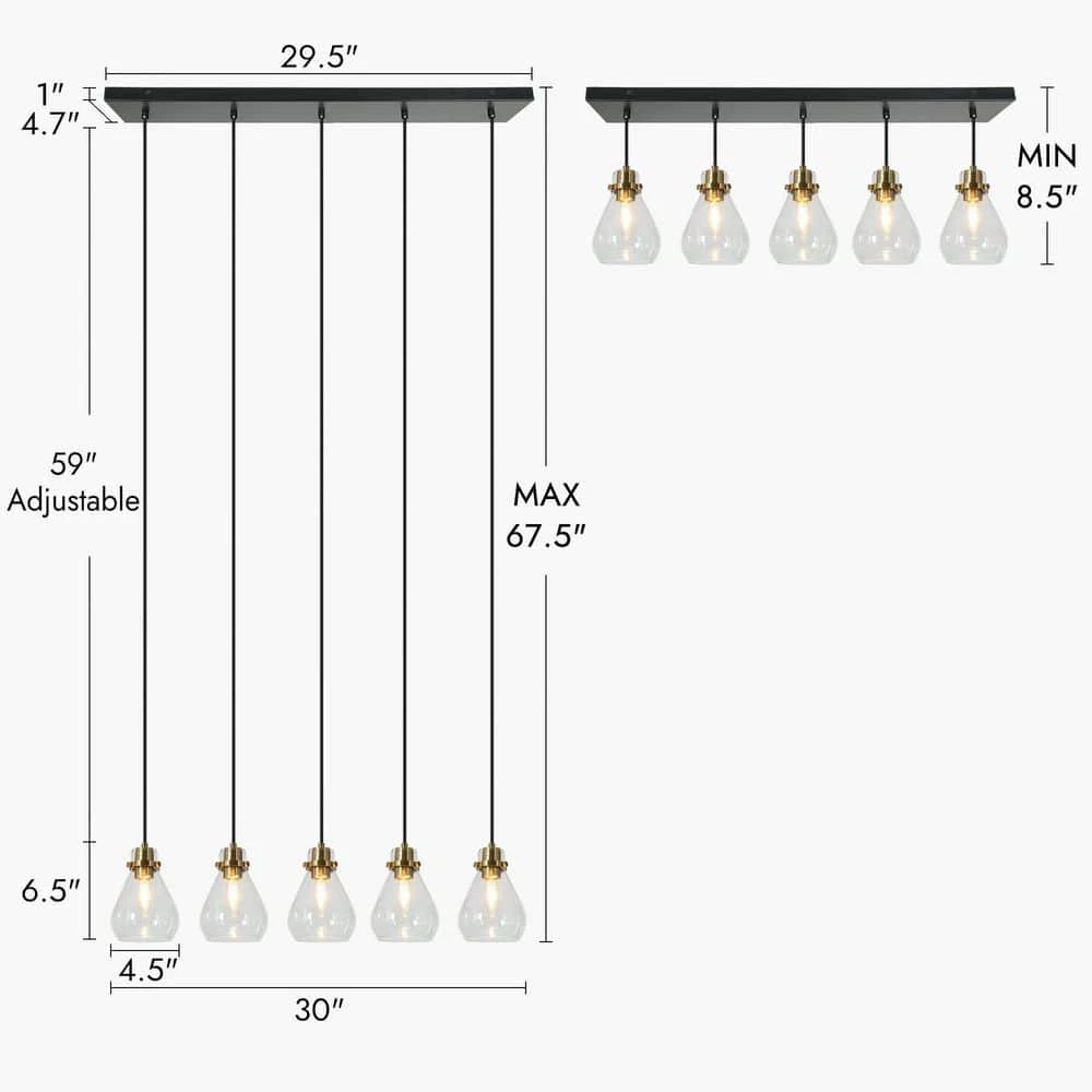 - HANGING HEIGHT ADJUSTABLE: Comes with 5 59-in long cords, and each of the cords is adjustable. Customers can adjust the hanging height of the light from 10.5-in (min) to 67.5-in (max)