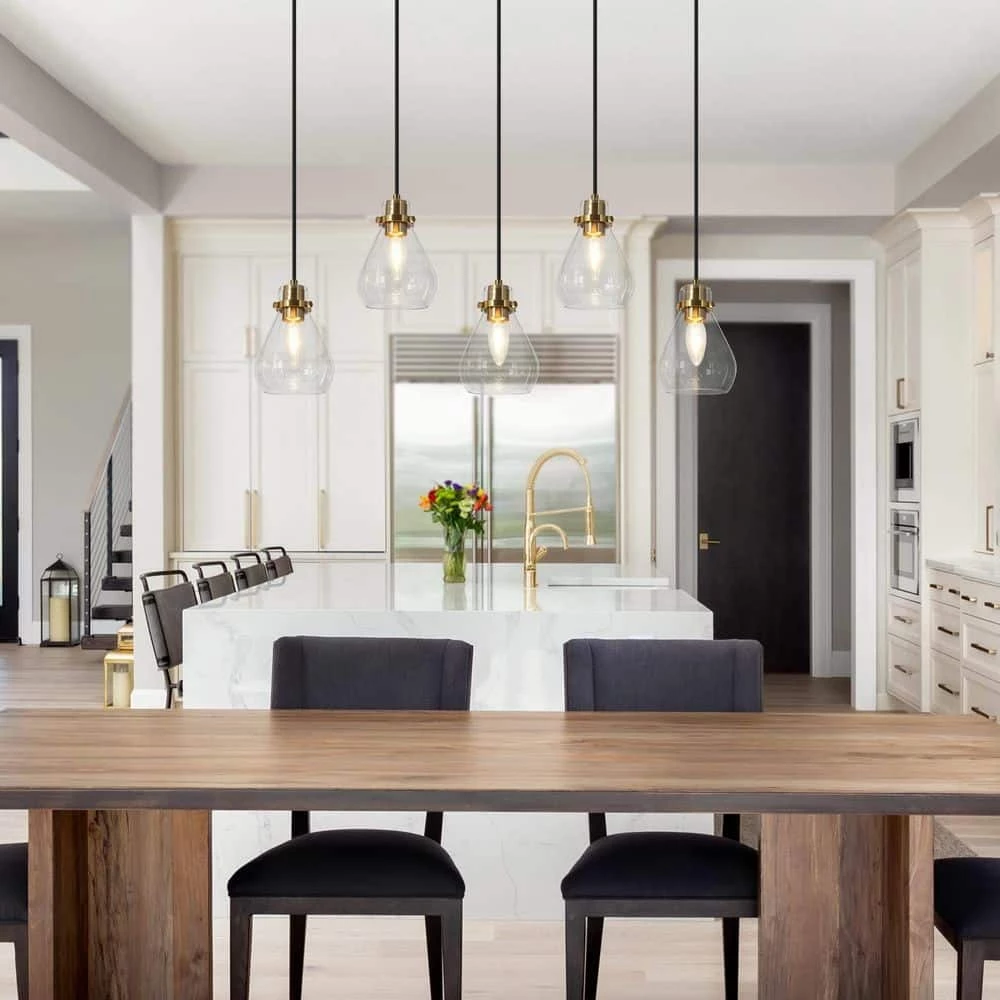 To create a dining room that is full of modern appeal, choosing a proper light fixture is important. The 5-Light linear chandelier from Uolfin Lighting could be an ideal choice. Matte black combines shiny brass, and the chandelier features a beautiful color finish, solemn and trendy, enhancing the modern theme of the dining area. Shaped linear, the chandelier is designed to hang over the long dining table or kitchen island. Each of the lights comes with a 59 inches wire, so customers can easily change the hanging height of the light by cutting part of the wire. When hanging over the kitchen island/dining table, the chandelier brings suitable illuminance. Light passing the clear glass shades emits a warm and soft glow and brings a cozy ambiance.