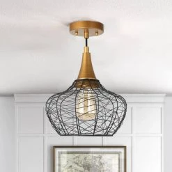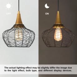Fashioned after the industrial era, this 1-light modern black pendant light offers minimalist styling for the best of both worlds. A modern twist on rustic industrial style for today’s home, the perfect combination of industrial black and contemporary brass gold, this 1-light woven lantern chandelier lighting fixture by Uolfin will best decorate the transitional design in your bedroom, living room, foyer/entryway, laundry, kitchen island, dining room, or office, cafe. The open-bottom framework makes it easier to install the max 60-watt bulb thus adding glowing charm to your spaces. Fix in pair or in an array of the industrial pendant light for a stunning lighting effect.