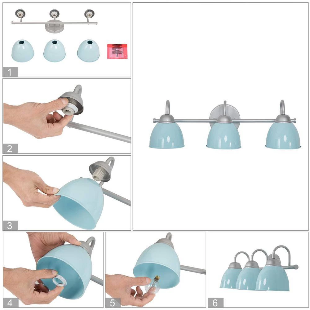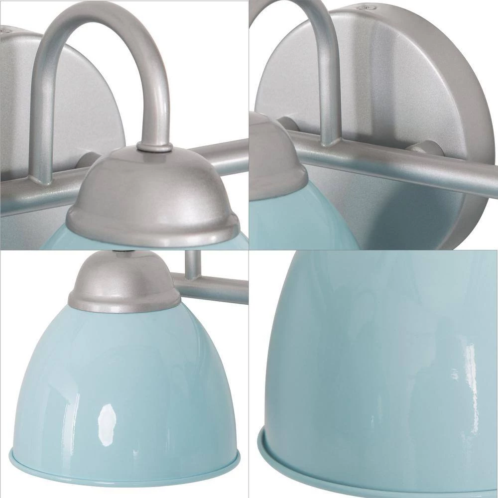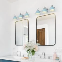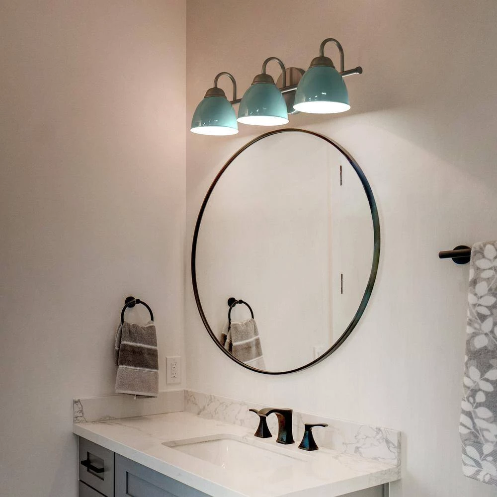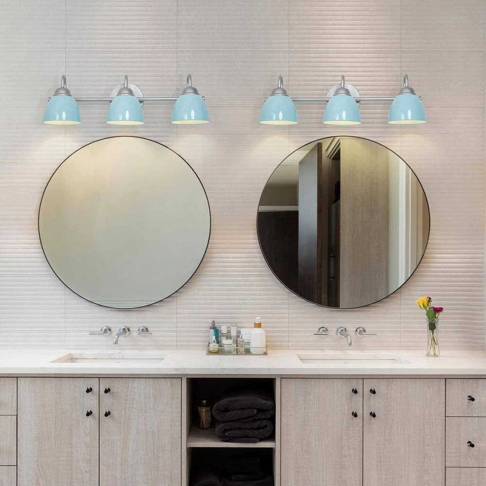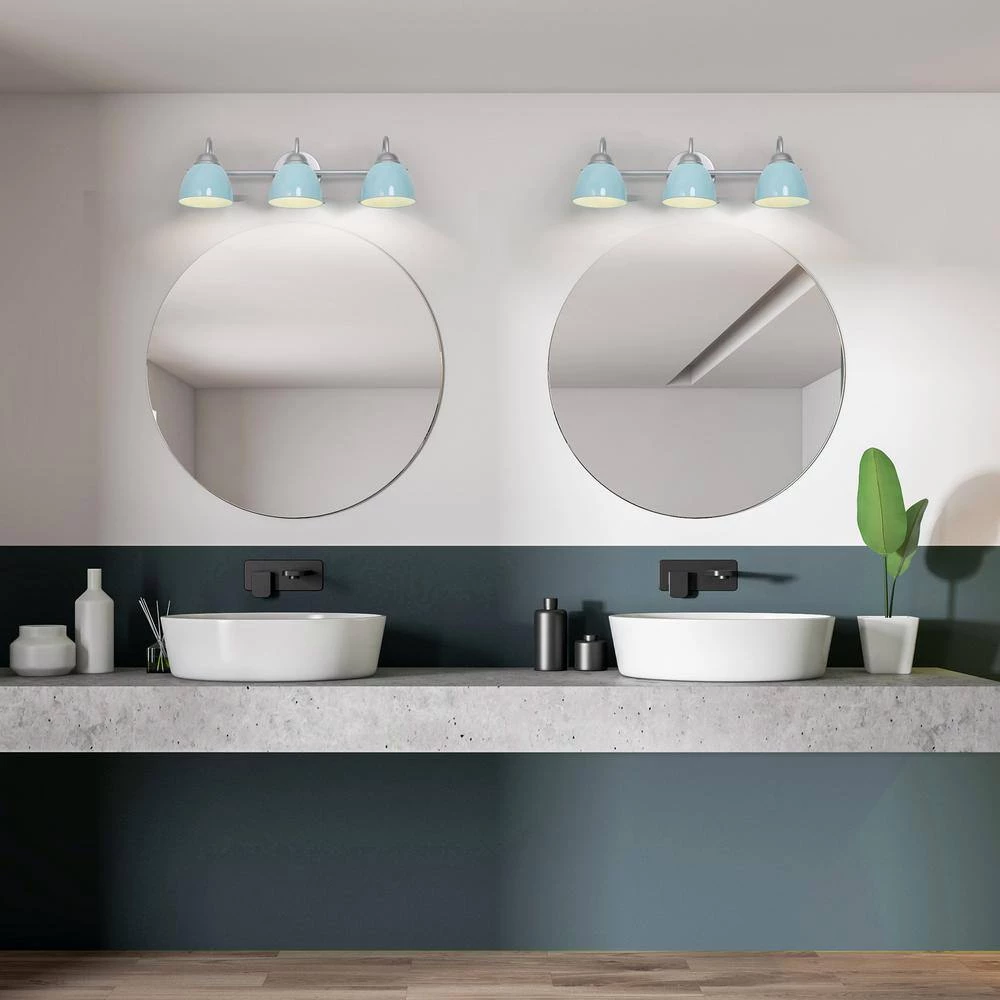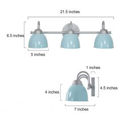 Bring a boost of brightness and sassy Mid-Century Modern charm to your bathroom with this 3-light baby blue bathroom wall sconce by Uolfin. Marrying modern and contemporary elements, this coastal metal light fixture is coated in baby blue accents, featuring a round backplate, curved arms, and a slender horizontal bar in a solid finish for a minimalist contemporary feel. This classic yet stylish bath light diffuses light from 3 compatible 40-Watt medium-base bulbs (not included) upward or downward for added customization. It also works with a dimmer switch (not included), allowing you to switch up the lighting whenever inspiration strikes. The cutting-edge wall sconce can wash away your fatigue, and make you feel the comfort and warmth of your home to the greatest extent. You’ll love how this light can transform your home with its striking style and function. If you’re searching for chic wall light ideas to add to your charming bathroom, powder table, foyer/entryway, or bedroom, the contemporary wall sconce is a versatile choice.