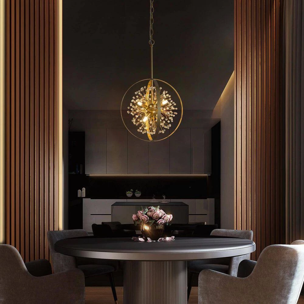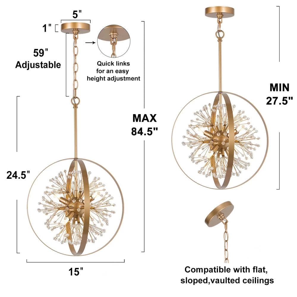 When this Modern Gold Globe Chandelier Pendant Hanging Light by Uolfin Lighting enters your home, it brings not only lighting but also a unique little world. This island chandelier light takes a gold design and absorbs both modern and classic design features. The elegant globe chandelier pendant hanging light is shaped in a cage and sputnik design, spreading a heavy modern retro sense. The classic designed chandelier is connected to the round canopy by a 59-inch adjustable suspension chain, suitable for flat or sloped ceilings. 4-Light bulbs (not included) are required, with the bulbs arranged radially, and the open design not only allows the light to illuminate your room from all directions but also makes it easy to access bulb replacement to clean dust with a feather duster or clean dry cloth. Whether you are modern, transitional, industrial, minimalist, cottage, farmhouse, or contemporary style, you can easily accept this semi-flush mount light. If you are also looking for such lighting to hang in the living room, bedroom, kitchen, dining room, foyer, corridor, or stairwell, this gold ceiling light will be a versatile choice.